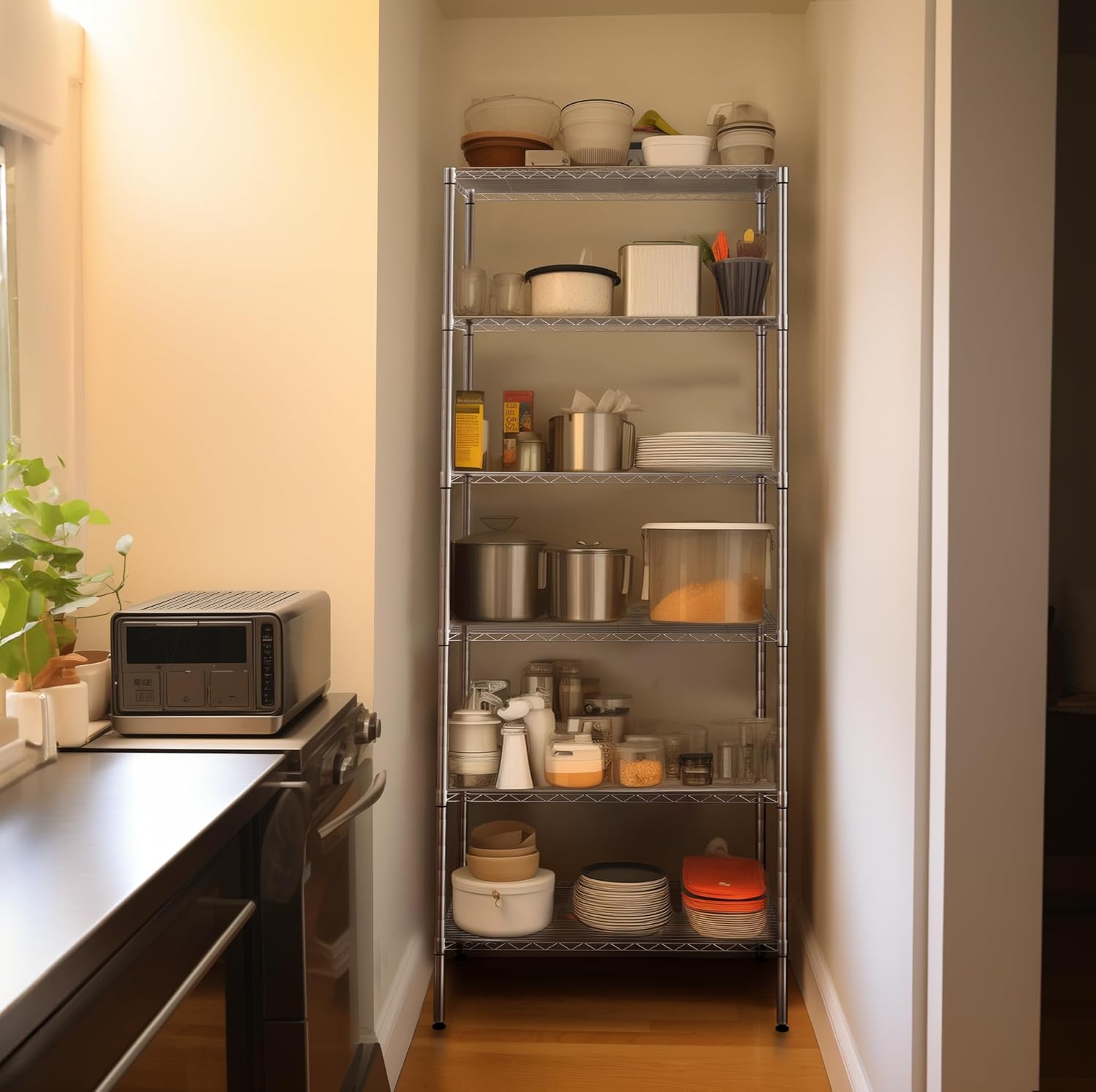 Finnhomy 6-Tier Wire Shelving Unit Adjustable Steel Wire Rack Shelving 6 Shelves Steel Storage Rack or Two 3 Tier Shelving Units with PE mat and Stable Leveling Feet, NSF Certified, Chrome