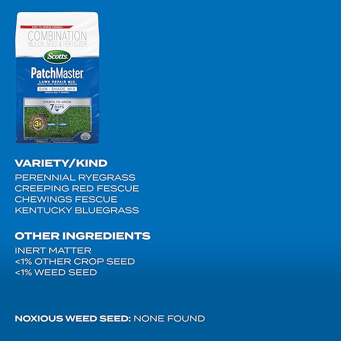 Scotts PatchMaster Lawn Repair Mix Sun + Shade Mix, Combination Grass Seed, Fertilizer, and Mulch, 10 lbs.