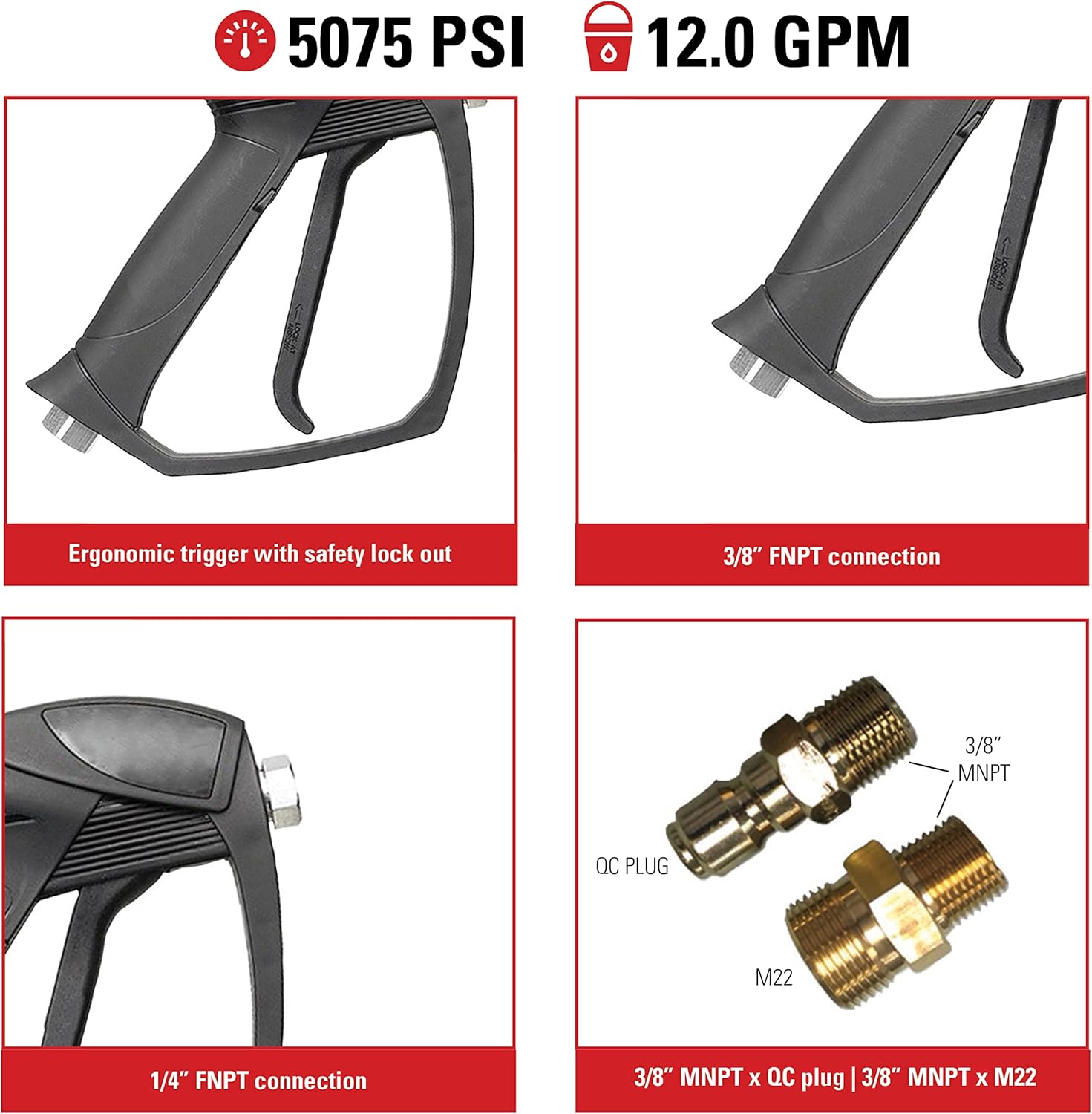 - Easy to use: This Spray Gun features threaded 3/8” FNPT inlet and 1/4" FNPT outlet for most hoses and spray wands; Universal fit that is easy to hook up to most high pressure hoses and spray wands with the Threaded M22 and Quick Connect (QC) adapters included