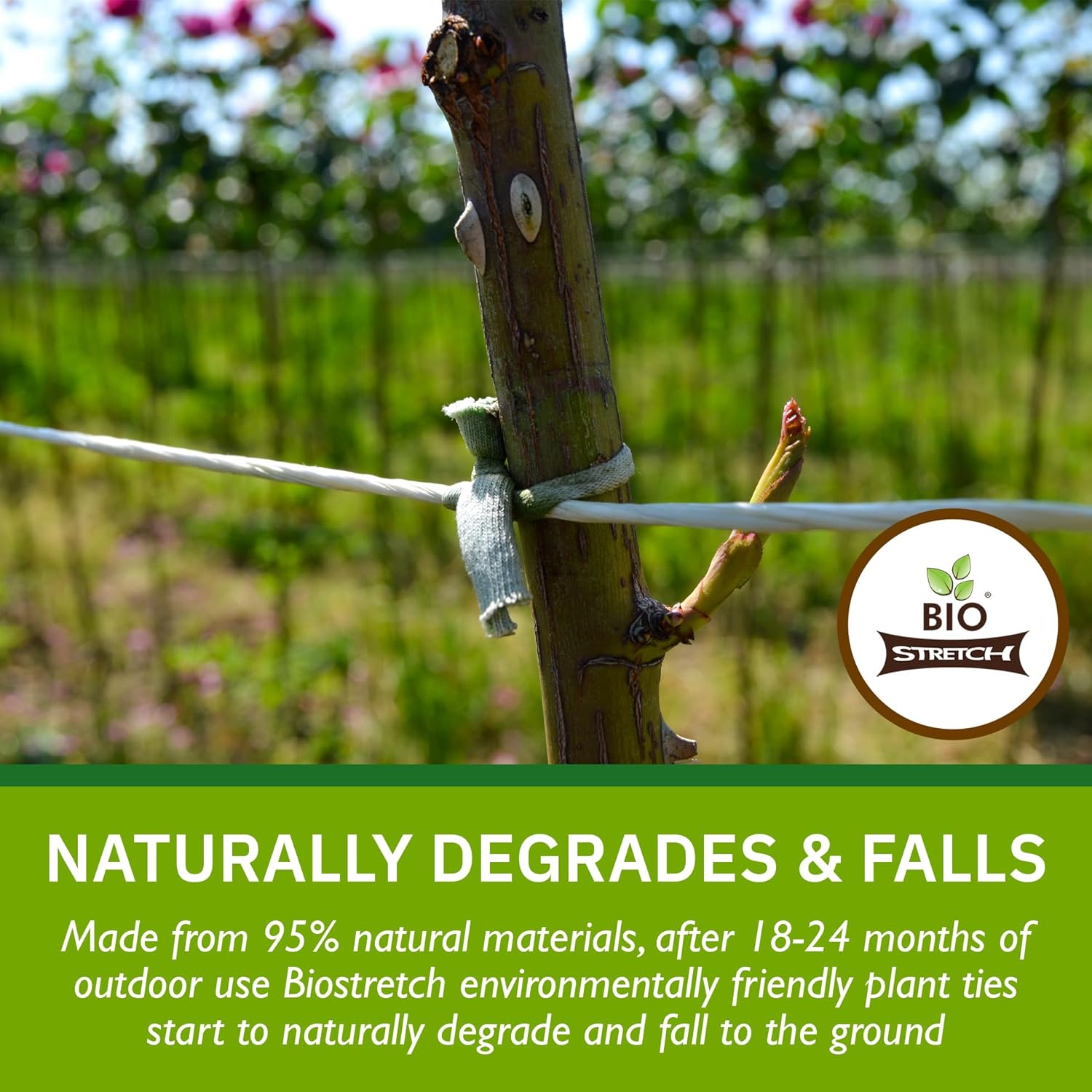 - NATURALLY DEGRADES - After 18-24 months of outdoor use, Biostretch plant ties start to naturally degrade and fall to the ground. Made from 95% natural materials, Biostretch is one of the most environmentally friendly garden plant ties on the market; simply collect any remaining remnants for a 100% organic garden or compost.