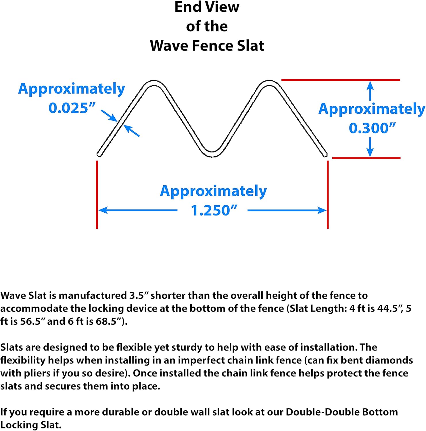 - Designed for 2" to 2.375" diamond and 9, 10, 11, 11.5 gauge wire. Slat width is approximately 1.25”. A 2" diamond will provide approximately 85% privacy, a 2-1/4” diamond will provide approximately 80% privacy and a 2-3/8” diamond will provide approximately 75% privacy (a larger diamond will have less privacy and a smaller diamond size will provide better privacy). Make sure you measure your chain link fence diamond before placing an order.