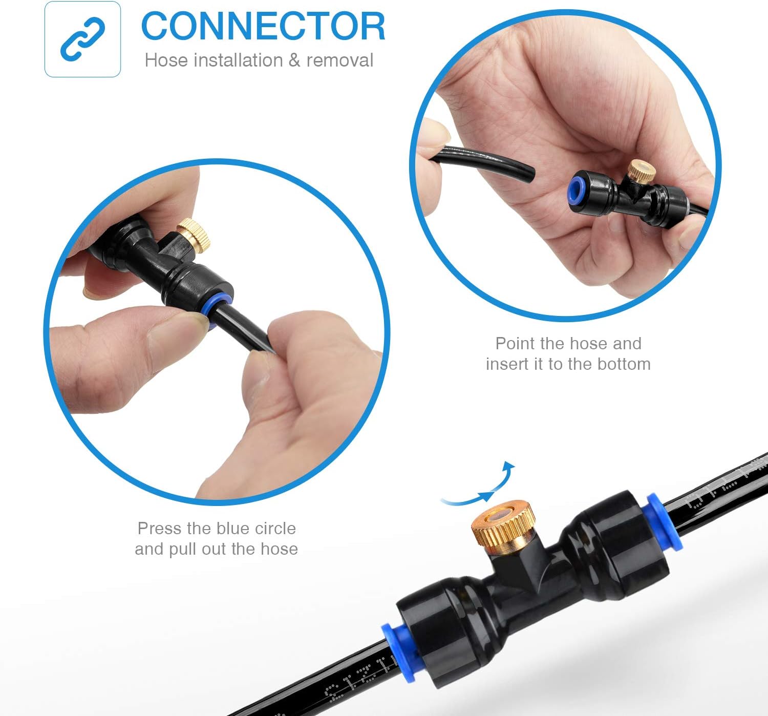 - Easy to Install: Instruction is included. Just need 2 steps in 3 seconds to set up the mister nozzles. NOTE: Recommended to fully and firmly insert the tubing into the tee connector to prevent leaking