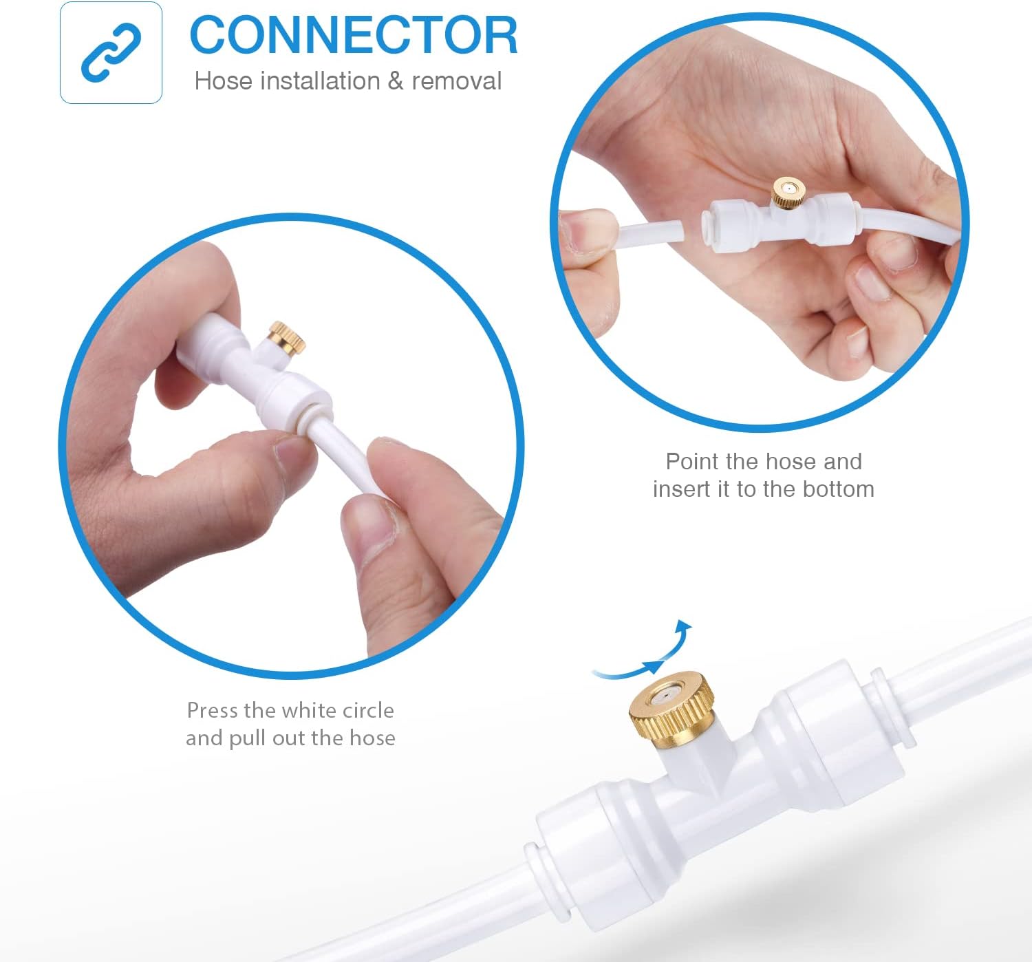 - Easy to Install: Instruction is included. Just need 2 steps in 3 seconds to set up the mister nozzles. NOTE: Recommended to fully and firmly insert the tubing into the tee connector to prevent leaking