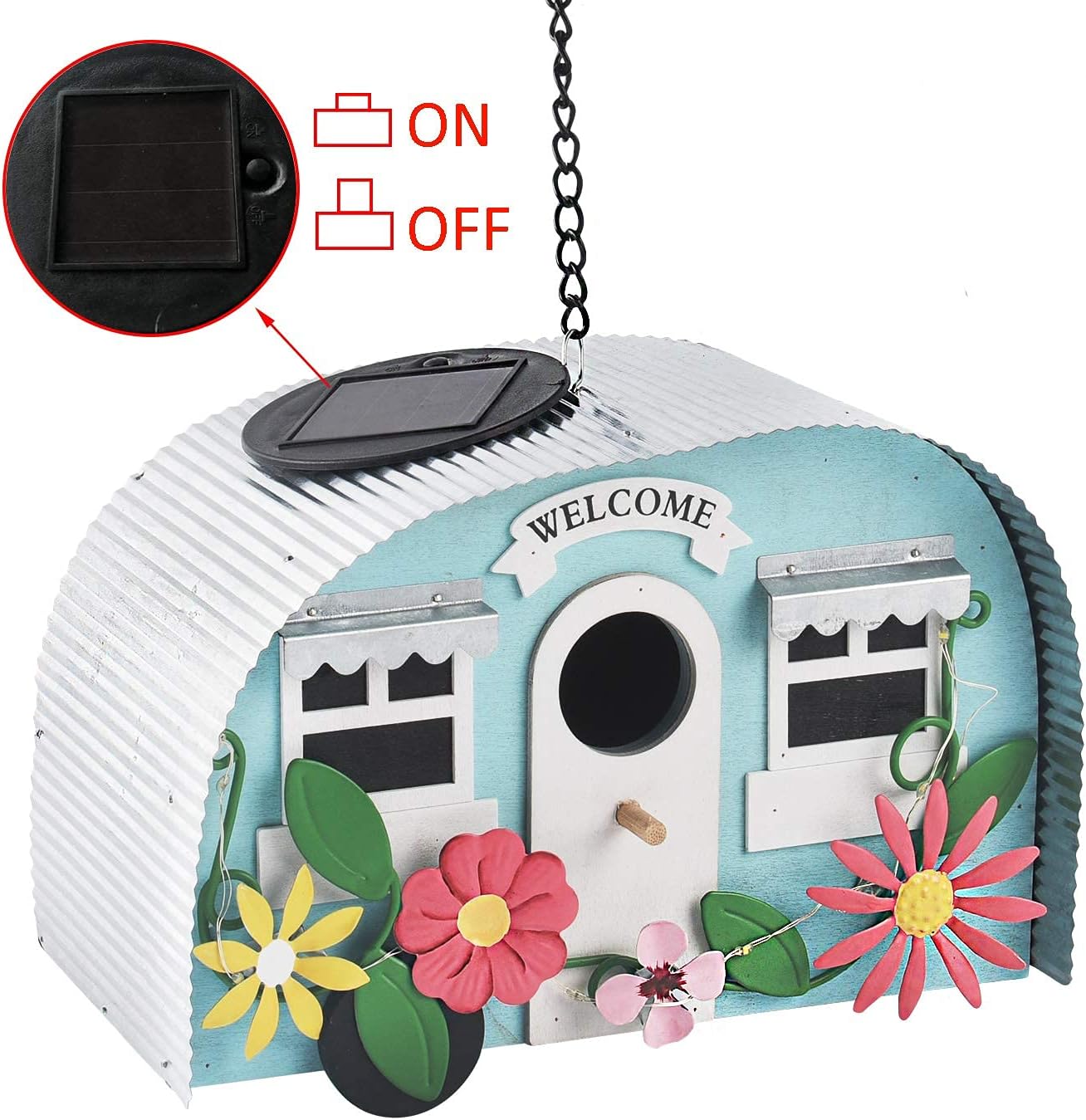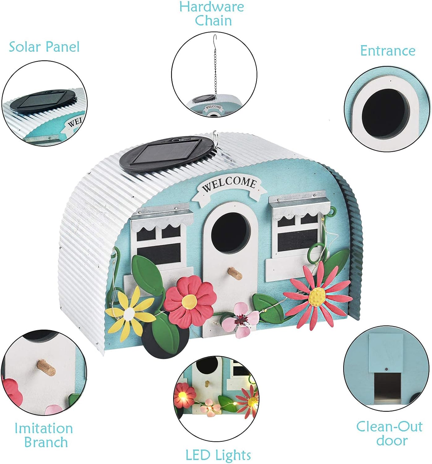 - Eye-Catching Handwork Birdhouses: The birdhouse looks like a little vintage camper trailer with flowers and a string warm white LED. It adds a fun and unique design element to your outdoor spaces.