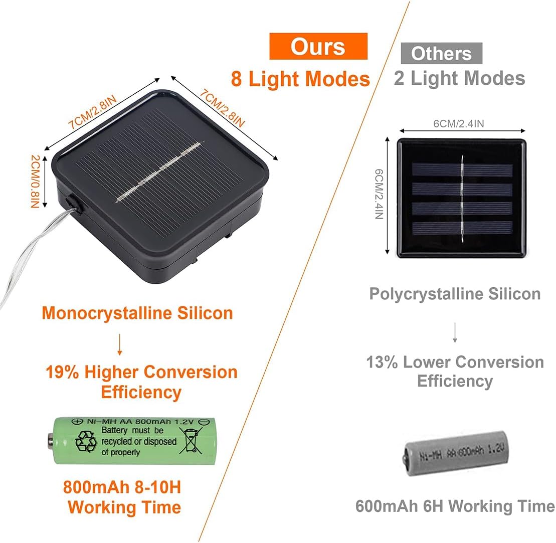 - 8 Lighting Modes with Memory Function: Our solar christmas lights have 8 lighting modes for you to choose: combination, in waves, sequential, slo glo, chasing/flash, slow fade, twinkle/flash, and steady on. Comes with memory function, remember last setting automatically after turn off the power, no need to reset again