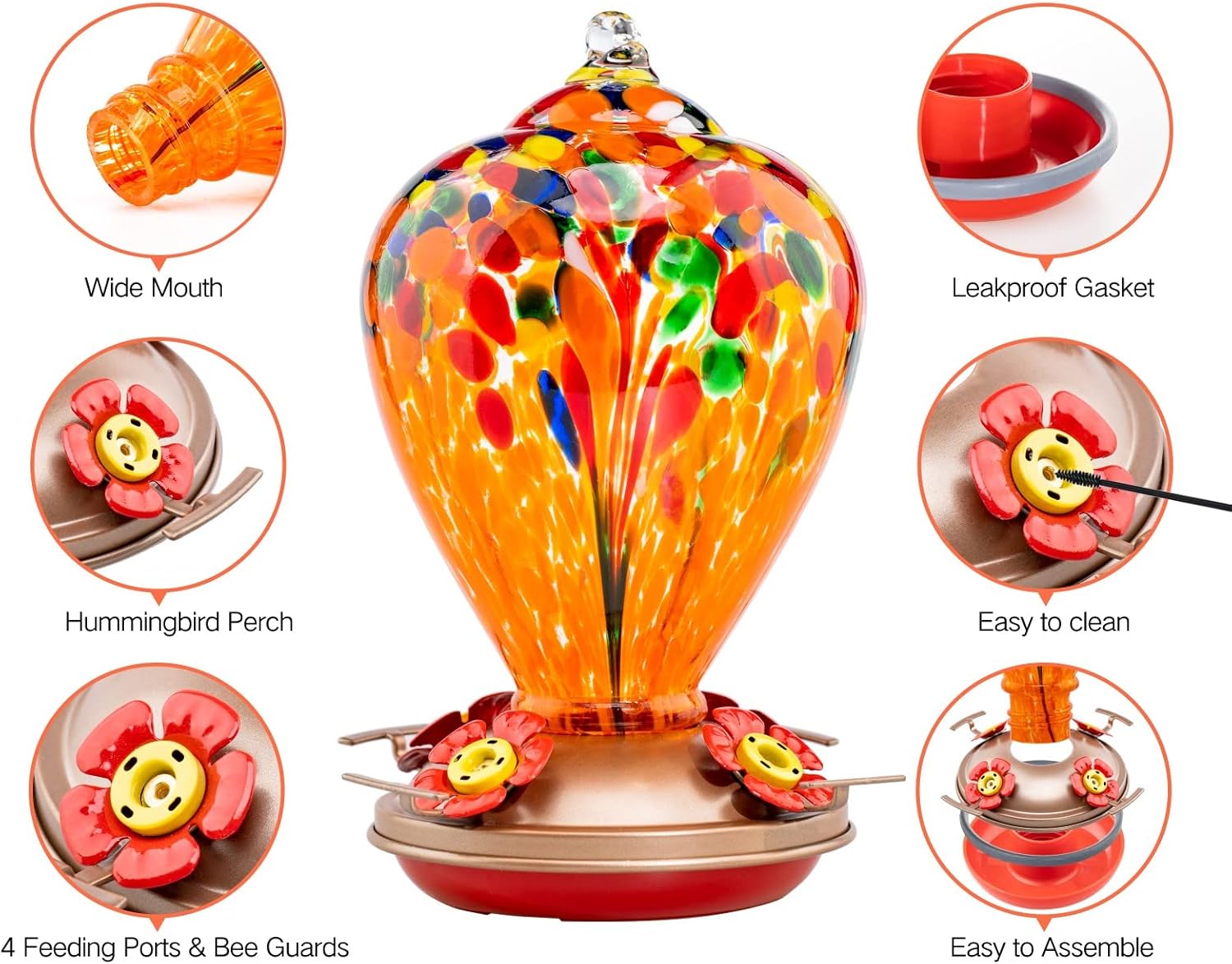 Muse Garden Hummingbird Feeders for Outdoors Hanging, Blown Glass Hummingbird Feeder Gifts for Mom, Garden Decor for Outside, Unique Gifts Idea for Women, 34OZ, Orange Fireworks