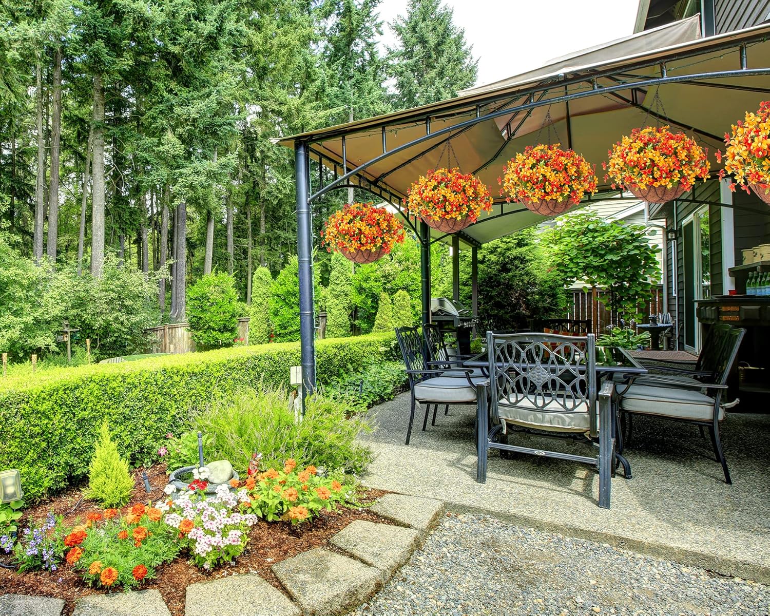 - SELF-ASSEMBLE:The beautiful hanging flowers in a basket,Easy to do with a semicircle green grass liner,insert flower stems to the grass liner and get a beautiful hanging basket with flowers in 5 mins,lightweight but steady.