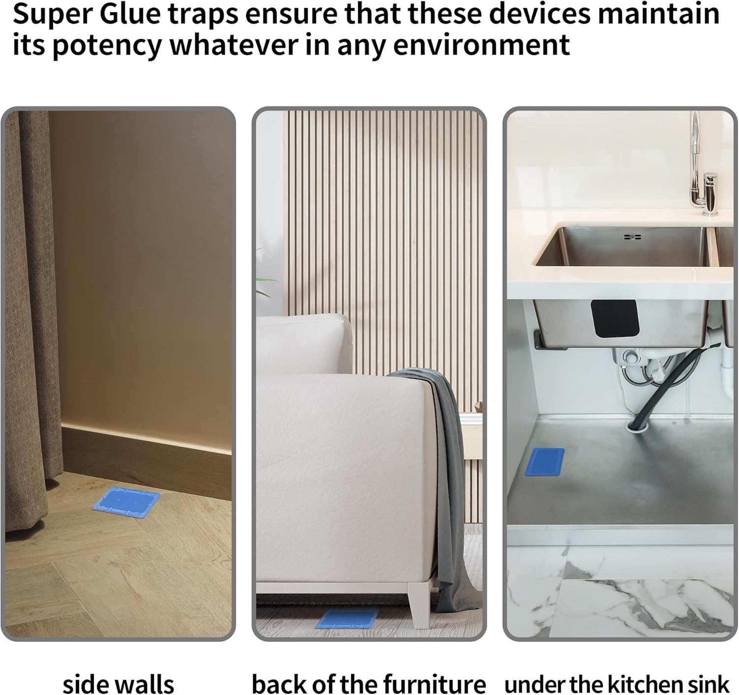 - Where to Place: We suggest you position sticky traps along active rodent and insects runways, such as along walls, under large kitchen appliances, in cupboards, and other areas where rodents and insects travel. Be sure to fit the glue trap flush against a wall where they will run over and stick to it.