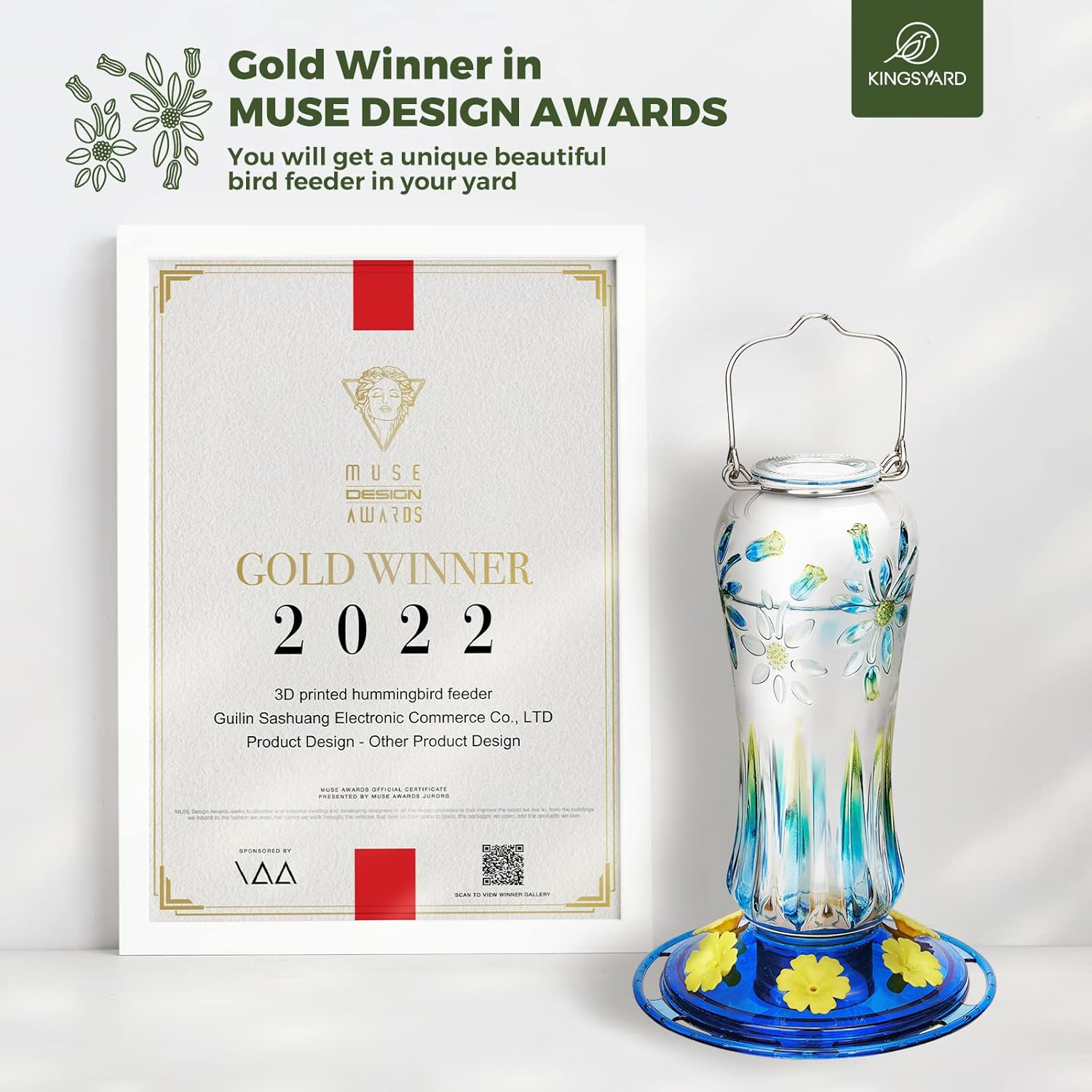- 【GOLD DESIGN AWARDS】This Kingsyard Hummingbird Feeder is Gold Winner in MUSE DESIGN AWARDS; A sweet gift for parents, children and friends; A bird watching gifts for people who love birds; A unique gifts for Birthday, Mother's Day, Thanksgiving and Christmas