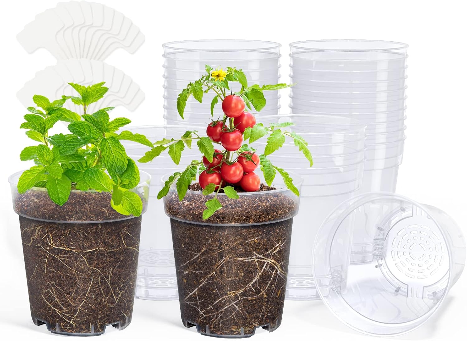homenote Clear Nursery Pots for Plants,5 Inch Plant Pot for Planting Plastic Seedling with Drainage Holes Seed Starter Flower High Transparency with 20 Labels (30 Pack)