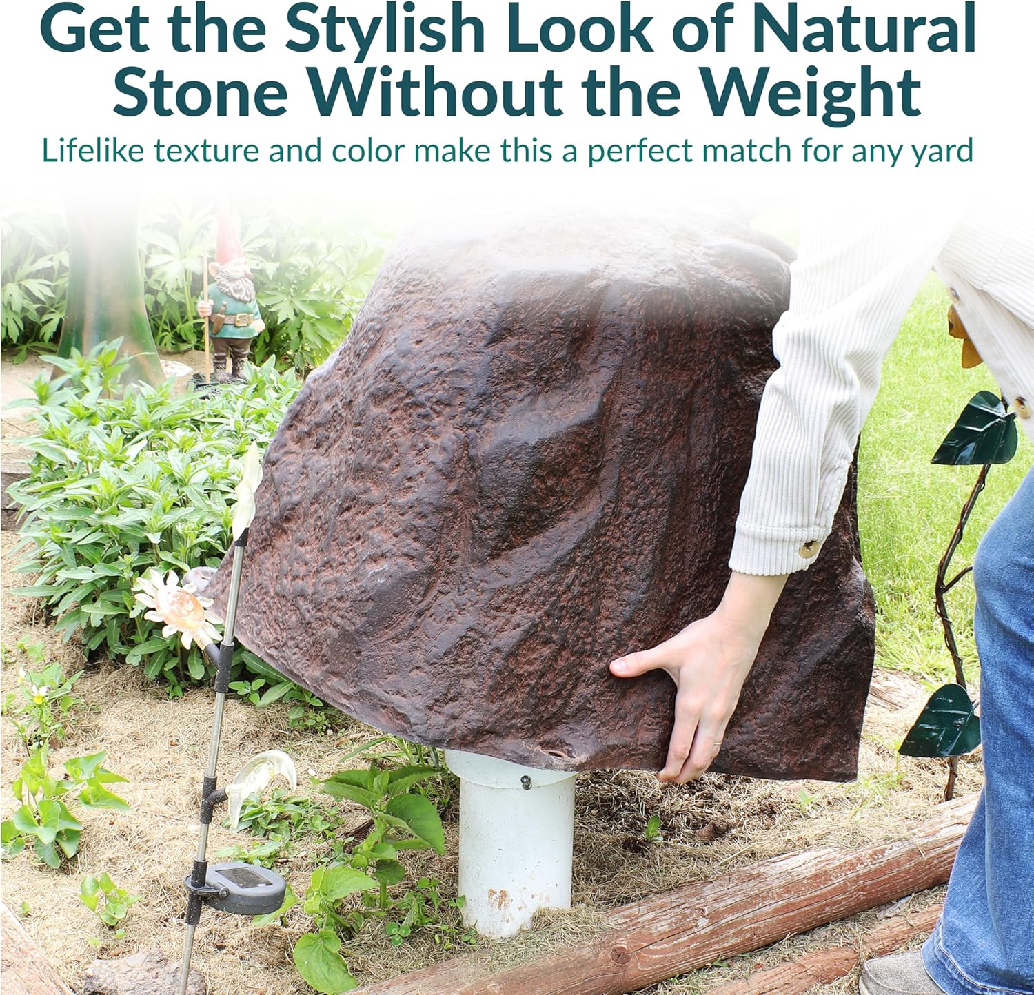- CONCEALS LANDSCAPE UTILITIES: Place this fake rock cover over a septic tank, well, sprinkler valve, pipe, or other unsightly objects in the yard. Push the stakes into the ground through the holes at the bottom of the rock to secure it over any object.