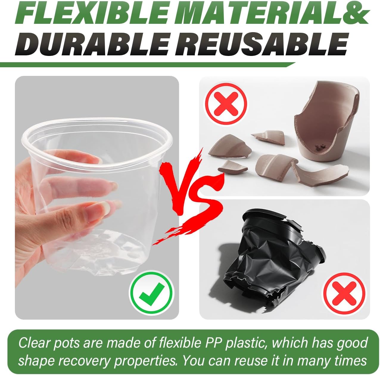 - 【Quality Plastic】Made of top grade plastic, no recycle material added, it can be repeat use for many times. The edge of the pots are sturdy enough for you to carry pots by one hand, two fingers.