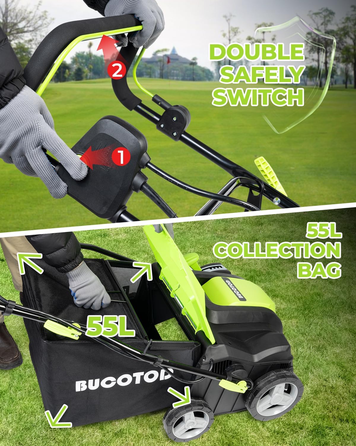 - SAFE & EASY OPERATION: BUCOTOD dethatcher scarifier featuring two switches to prevent accidental starts. Operating is a breeze – simply press to start. The ergonomic design 3-position adjustable rod caters to users of different heights, meeting the diverse needs of every family. Enjoy the ease of use without compromising on safety.