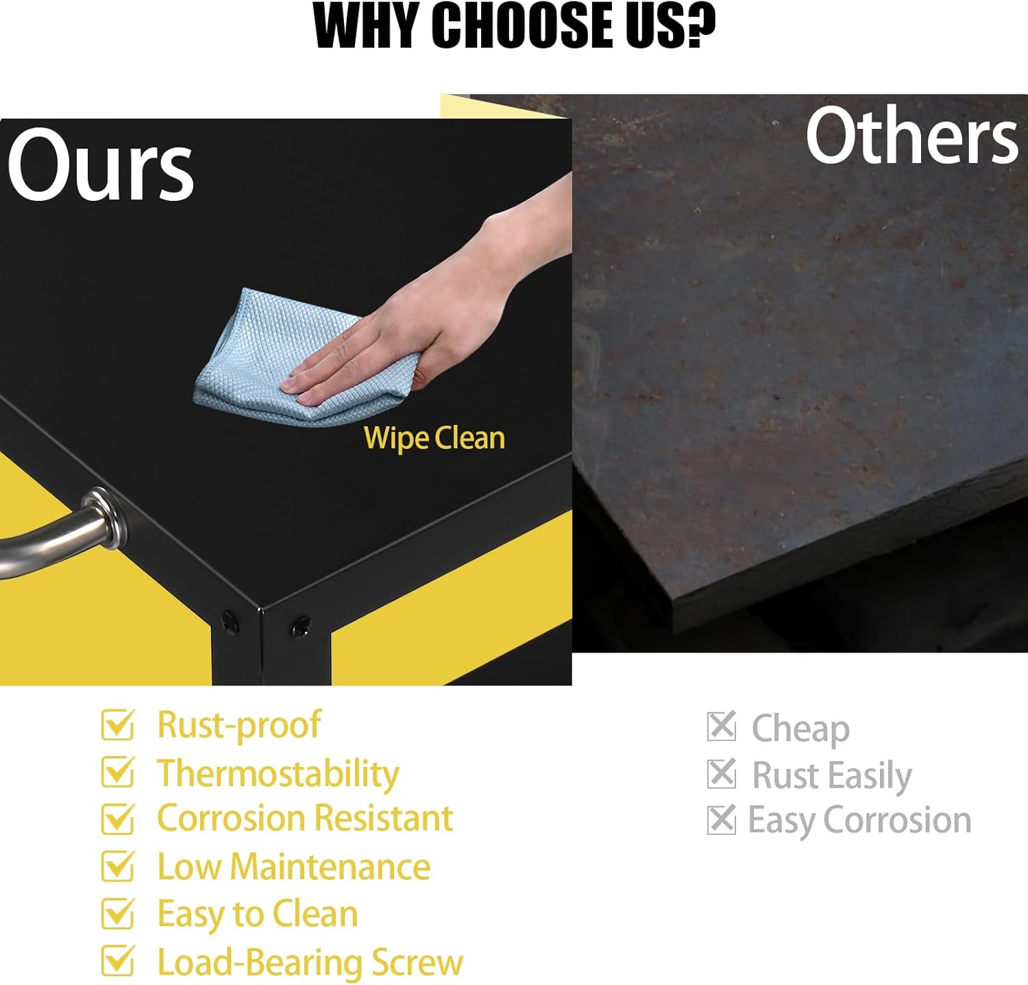 - 【Convenient Design】 This outdoor grill cart has two big wheels and two feet, keeping the whole table structure stable and also convenient for your operation. You can lift up the feet for moving and put down for usage. The ergonomic pusher design saves your strength