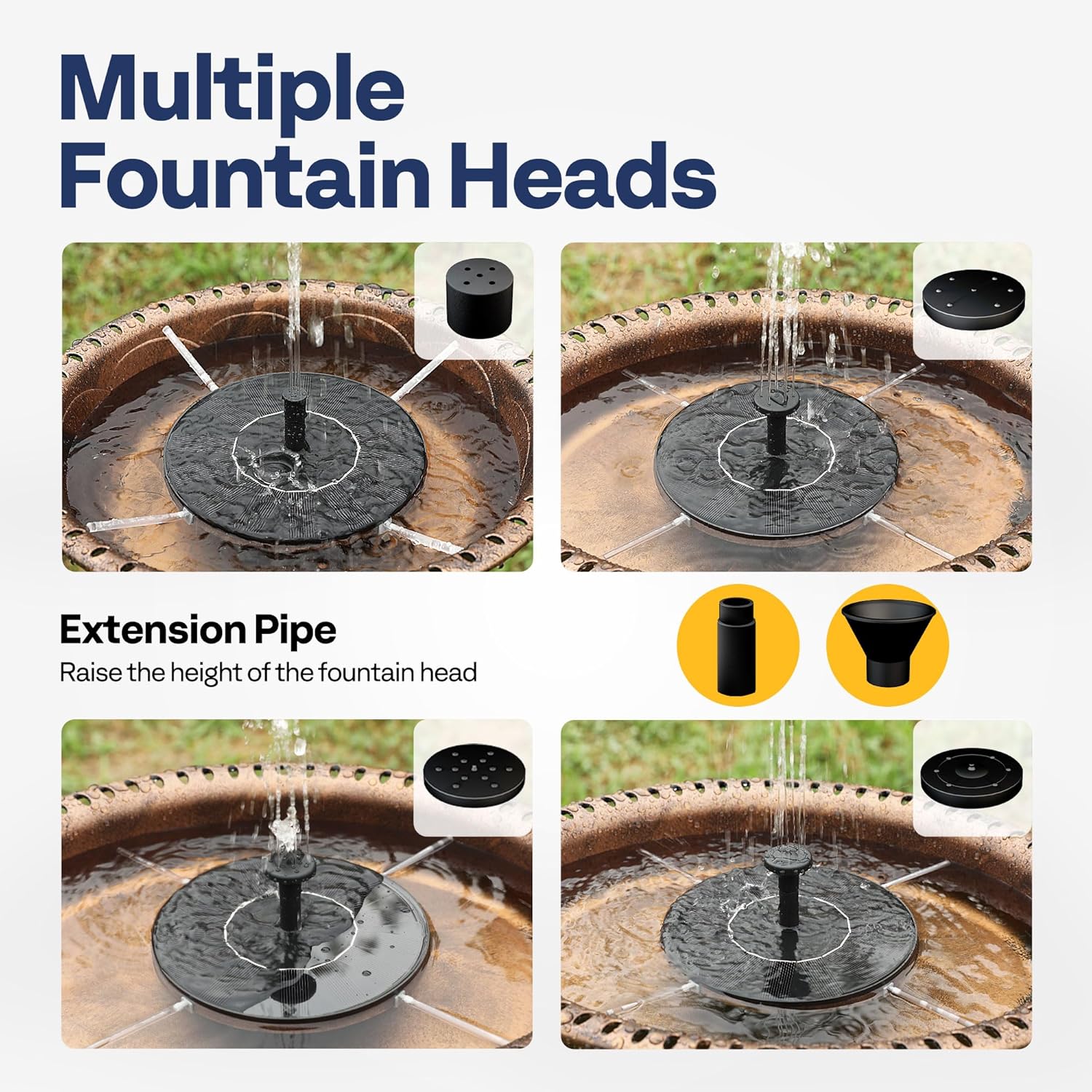 - COMBO SET: This package includes a 5-forked bird bath, a 1.4 W solar water fountain, and four different spray nozzles; The fountain can be configured to create a beautiful display with four different patterns, which may attract and entertain birds; The bird bath set is a suitable and lovely addition to any garden, patio, yard, deck, or other outdoor space
