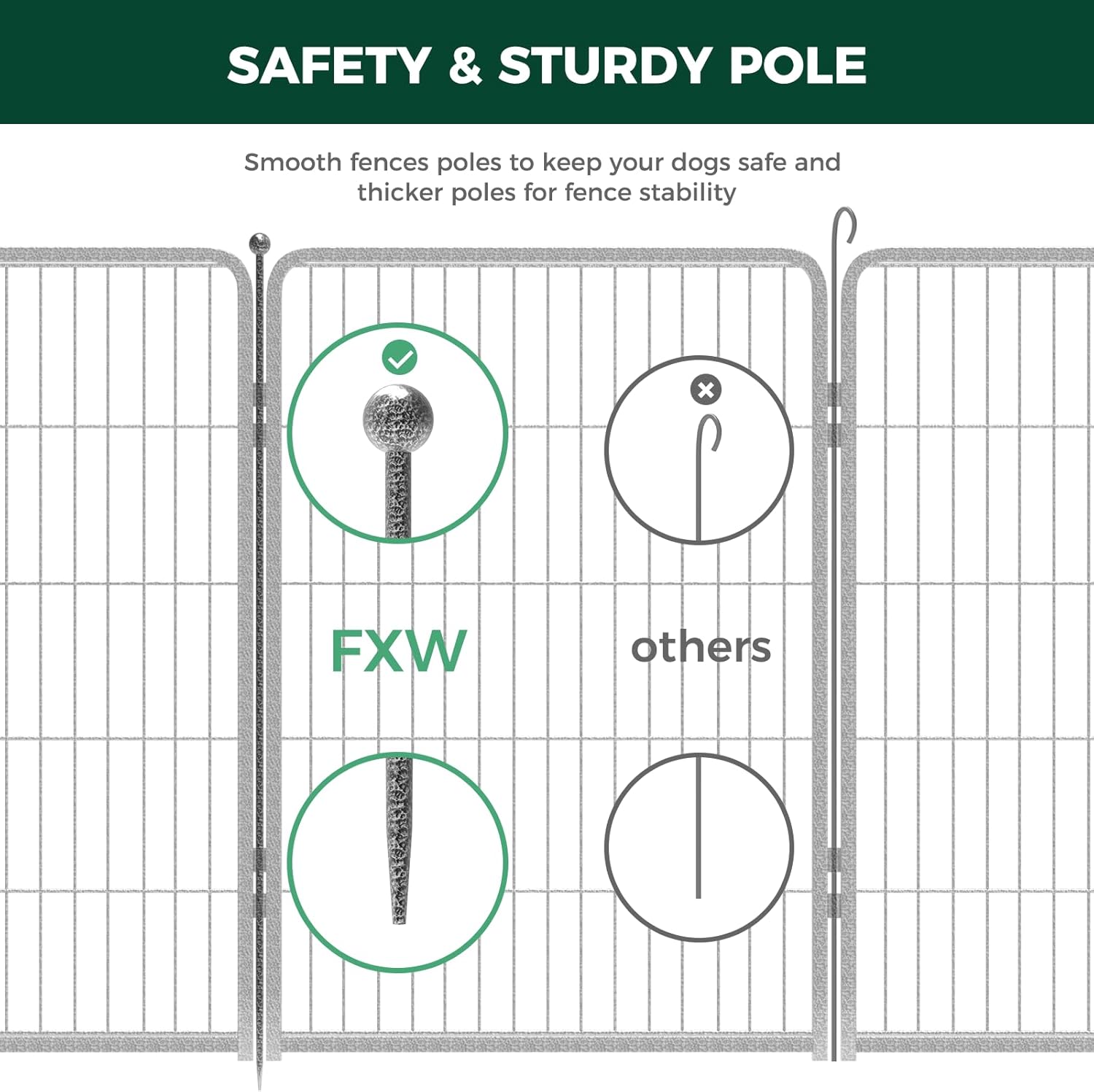 - Safe & Sturdy: Our fences have been tested by Intertek, an independent testing facility as well as passed California Proposition 65 to ensure safety for both people and our pets. Metal stakes are designed with rounded ball tips to protect from injury. The upgraded metal rods have been designed to be more easily inserted into the ground for more stability and rigidity, which ensures your dogs won't knock them over.