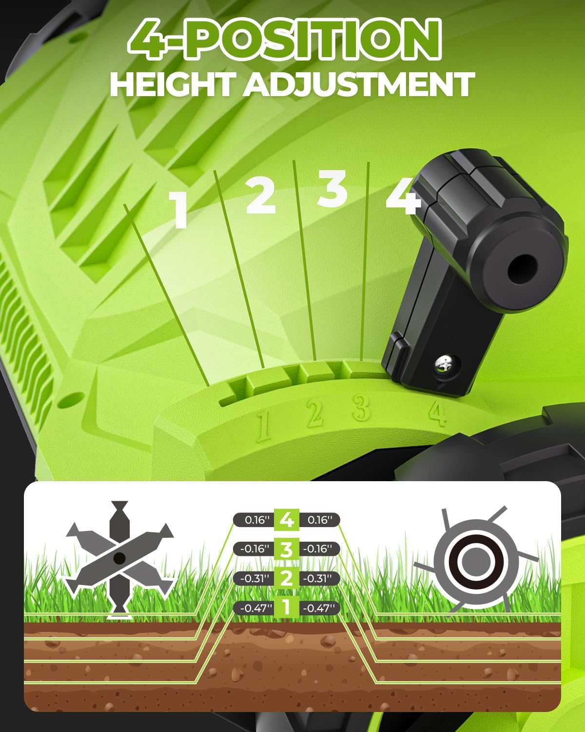 - 4-POSITION DEPTH ADJUSTMENT: Easy-to-operate lever easily adjusts the working depth from -0.47" to 0.16" to meet different lawn depth needs, convenient for lawn health maintenance work in different seasons.