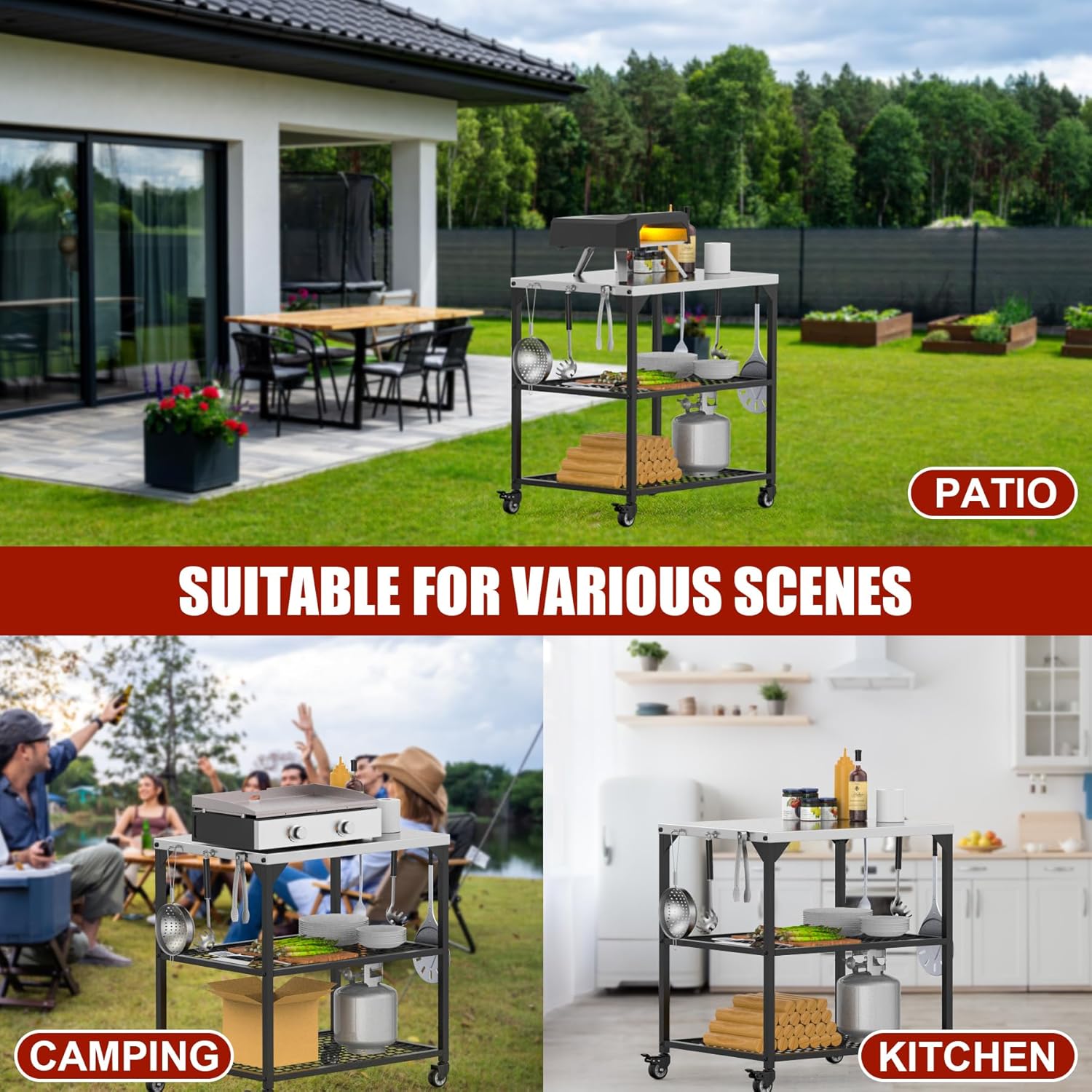 - PREMIUM MATERIAL: The core tabletop of the multifunction prep table is made of stainless steel, with an overall heavy metal construction and anti-corrosion coating for outdoor use in all weather conditions, ensuring long-lasting use. Plus, it is uneasy to be rust, warp, deformed or break. It is very easy to clean with just rag and water