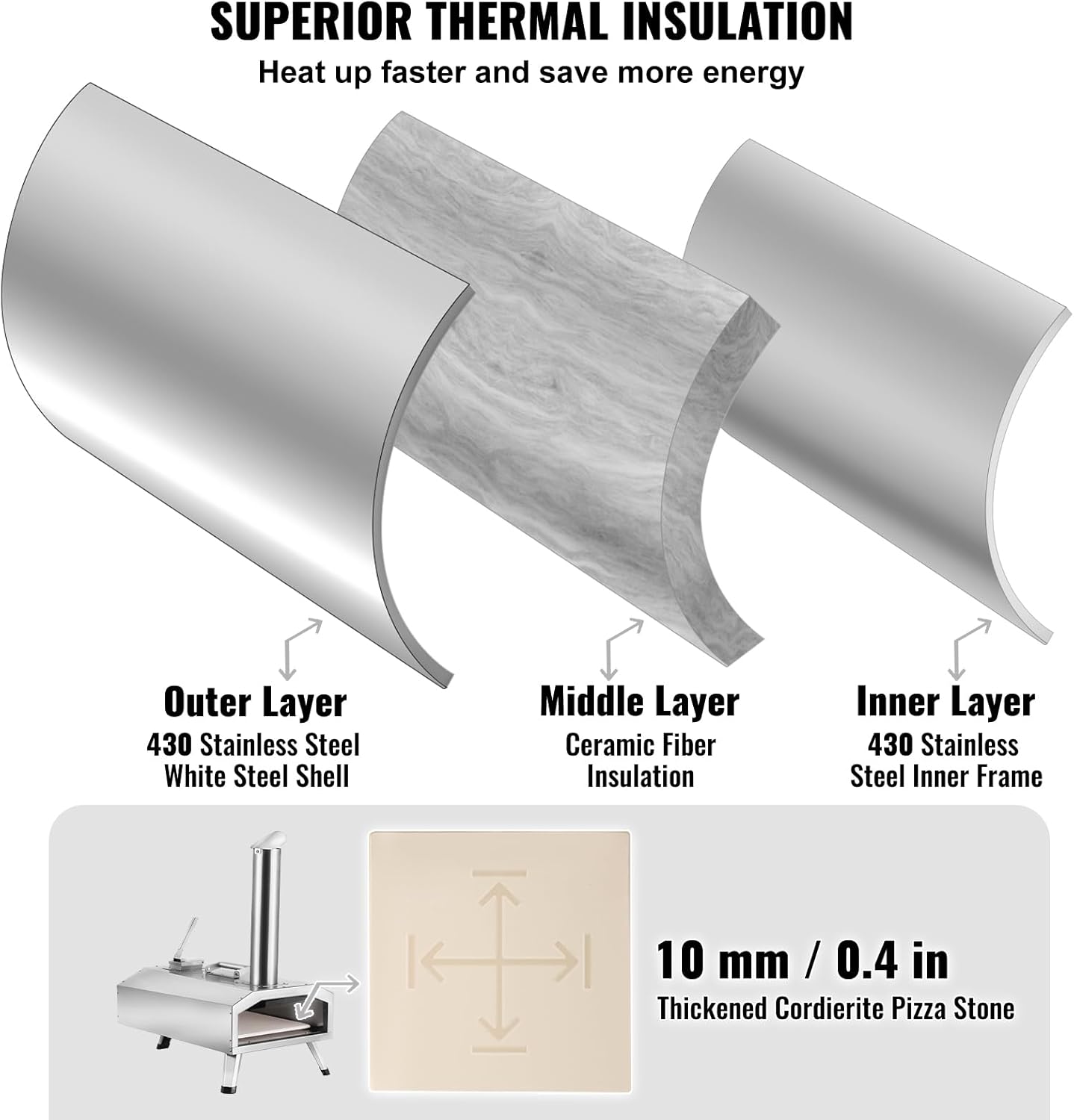 - 🍕 Durable Construction: VEVOR pizza oven withstands outdoor conditions and frequent use. Adopted a 3-layer design, promoting efficient heat circulation. Featuring a 430 stainless steel shell, and thick insulation cotton, it ensures durability and excellent heat retention