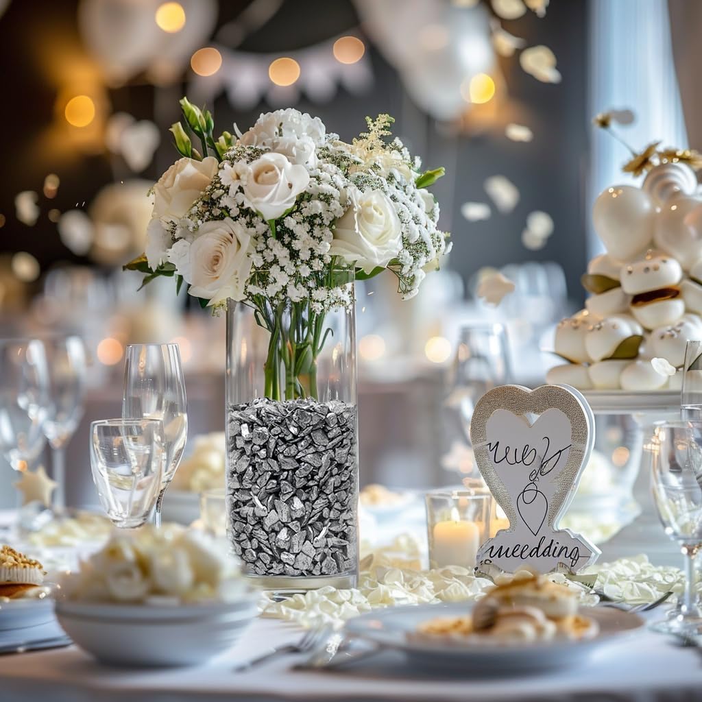 HappyFiller 3-7mm Candle Holder Mini Rocks,Vase Fillers Small Gravels Stones,Terrarium Succulent Planter Soil Cover Decor Pebbles,Aquarium Fishbowl Granule,Crushed Glass,Silver 0.81 LB
