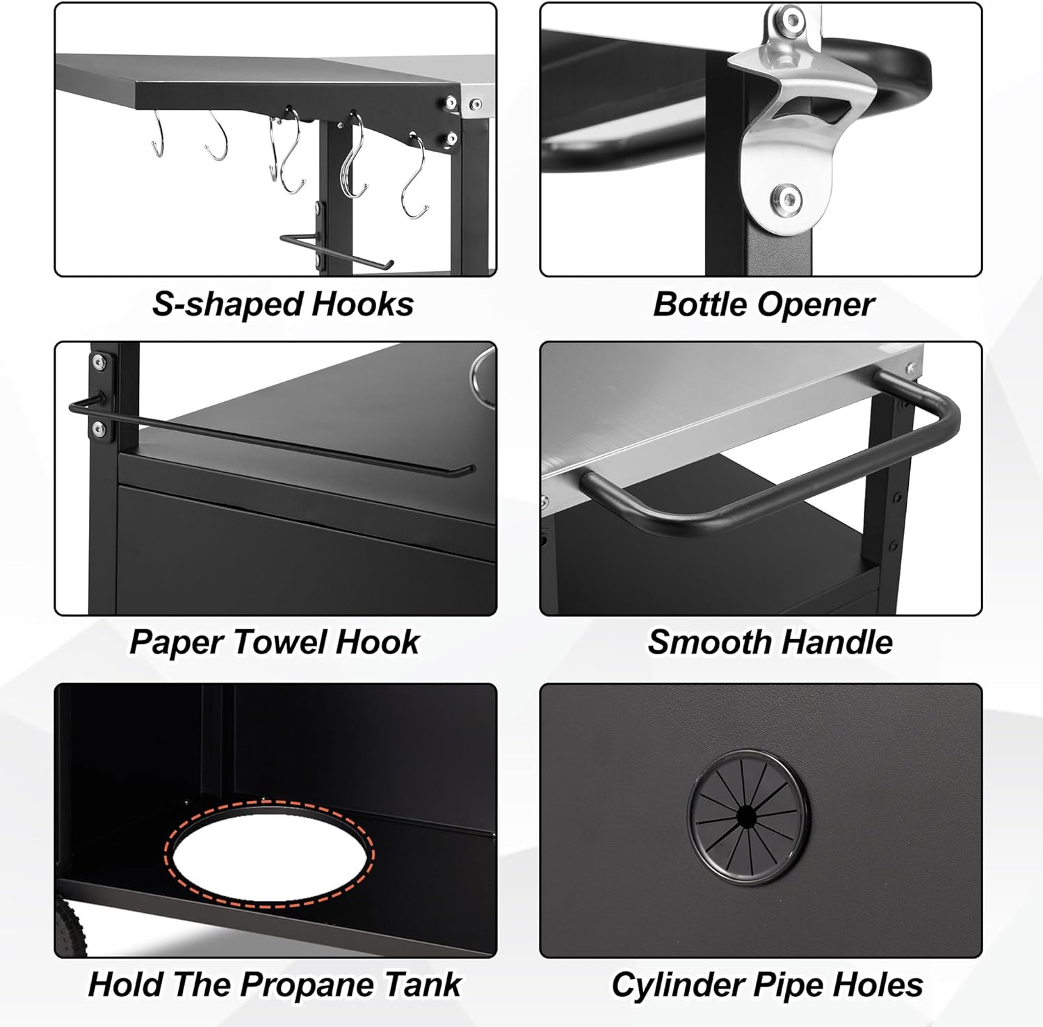 - Spacious and Convenient: The table is equipped with two 360°rotated wheels and two large wheels, and the handle help you to easily move indoors and outdoors. The two locking casters that hold it in place when you don't want it to move it. The table Includes the sidebar for paper towels, several s-shaped hooks and bottle opener to ensure you need. The storage cabinet allows you to store propane cylinders, (with holes in the back for gas line connections).