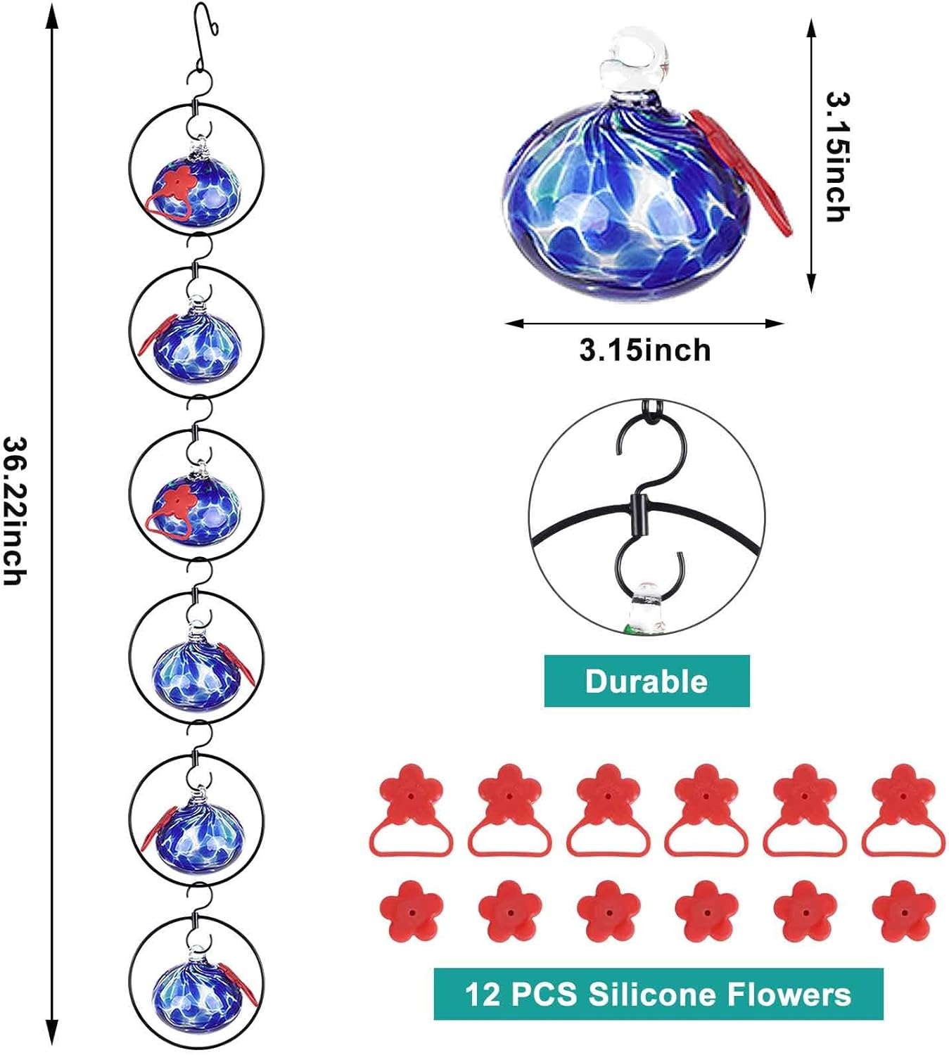 Flexible 6 Pack Hummingbird feeders for Outdoors Hanging Ant and Bee Proof,Detachable Hand Blown Glass Hummingbird Feeder with 6 Adjustable Silicone Perch(Dotted Blue)