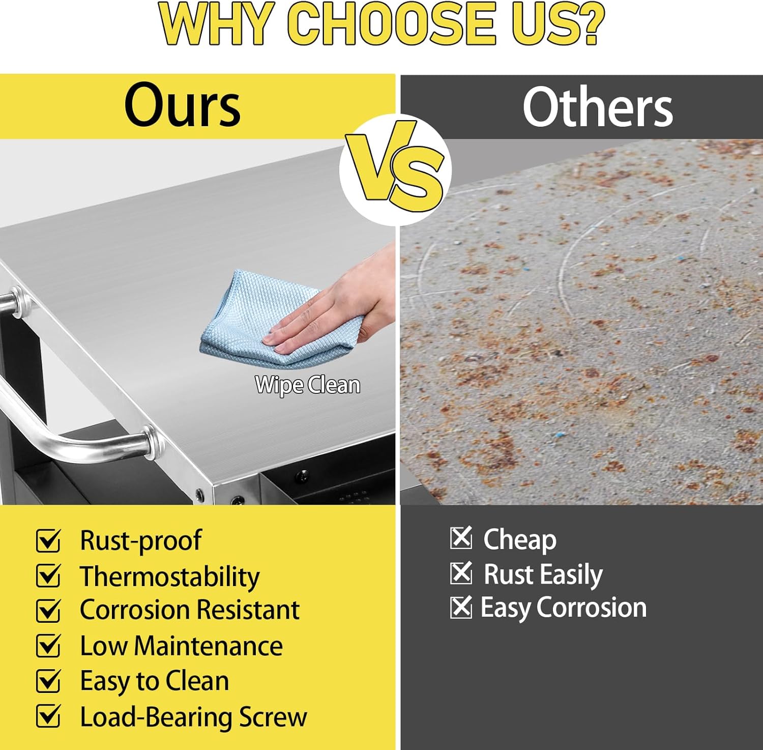 - 【Durable and Easy-to-Clean Surface】Crafted from high-quality stainless steel, the outdoor prep table provides a robust and easy-to-clean area perfect for food preparation. The cart’s body is made from sturdy iron, ensuring long-lasting durability for years of outdoor grilling