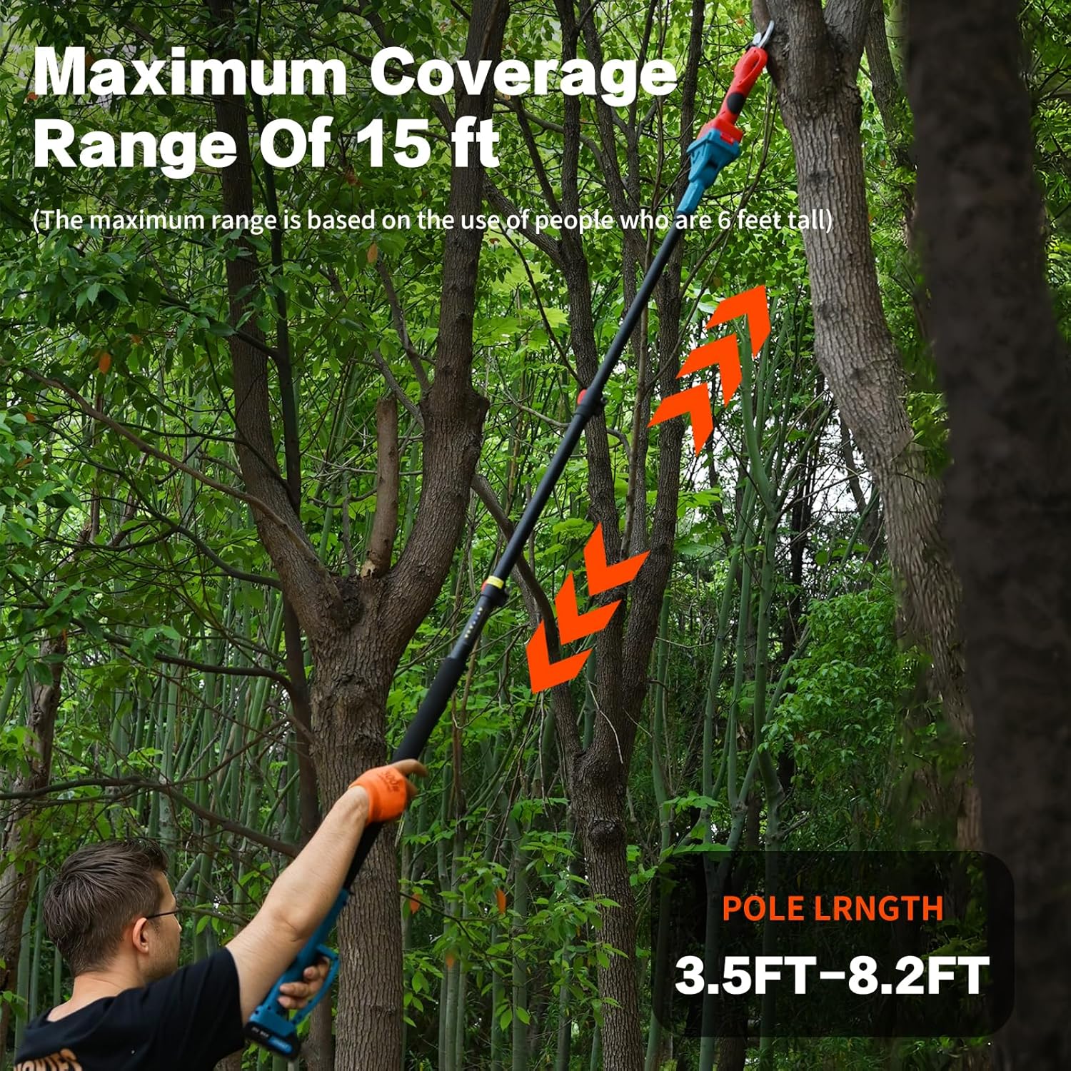 - Applicable Scenario:Tree pruning scissors with an opening diameter of 30mm,capable of easily cut through high-strength materials such as shrub branches and PVC pipes.Equipped with 3.5ft -8.25ft telescopic poles,up to 15ft (based on a 6-foot tall person),it can solve high-altitude pruning work.