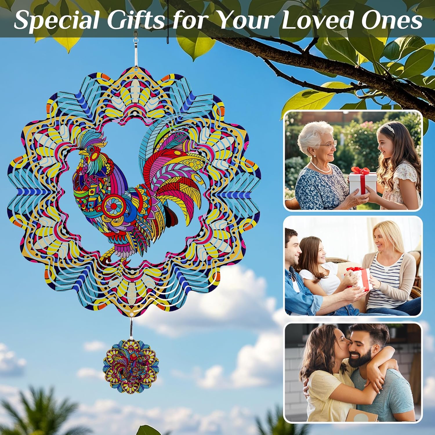 Wind Spinners Outdoor Hanging Rooster - Metal Chicken Gifts for Mom Women Grandma Men, 11.5 Inch 3D Stainless Steel Laser Cut Art Kinetic Wind Spinner for Indoor/Garden Porch Yard Decor