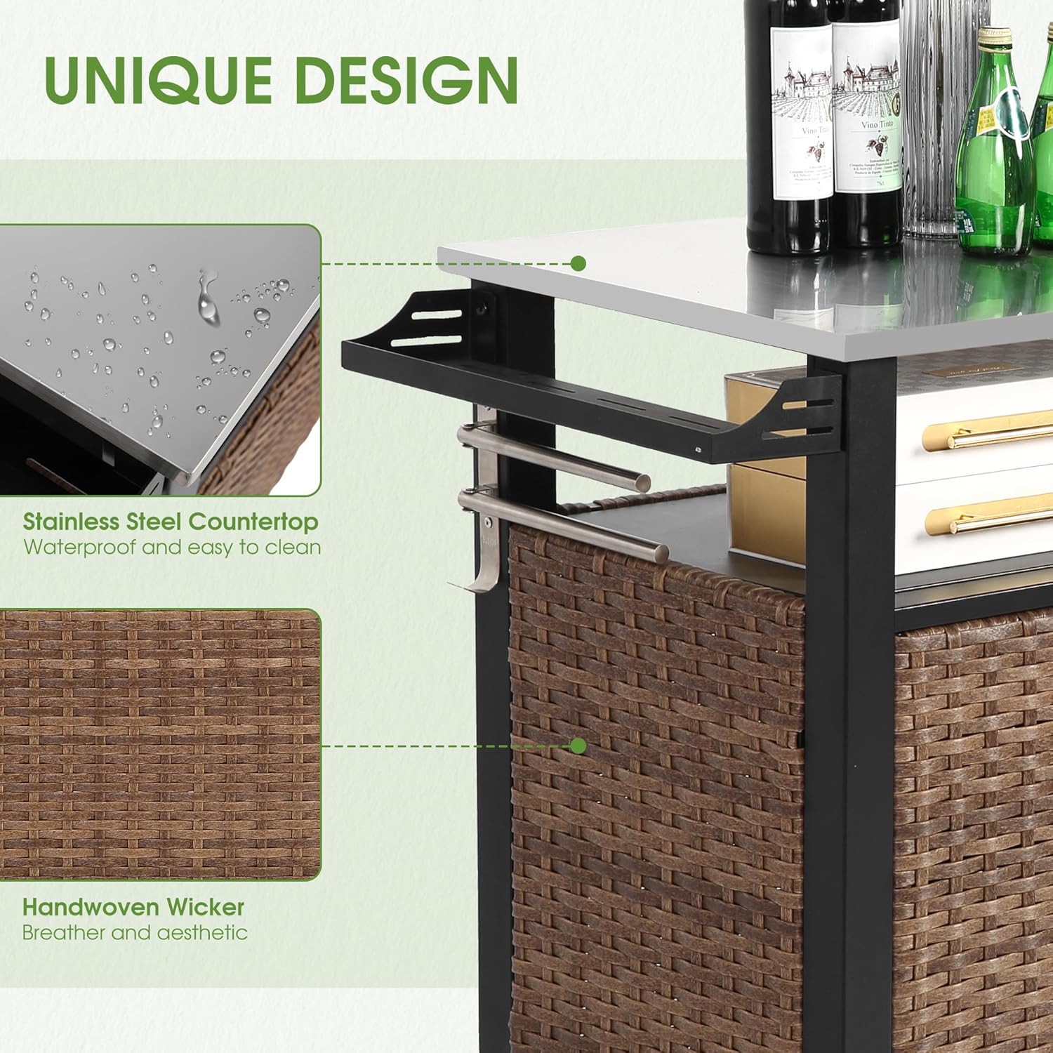 - Sturdy and Durable: This outdoor bar cabinet is weatherproof and covered with weather-resistant hand-woven wicker to withstand all weather conditions for long-lasting durability