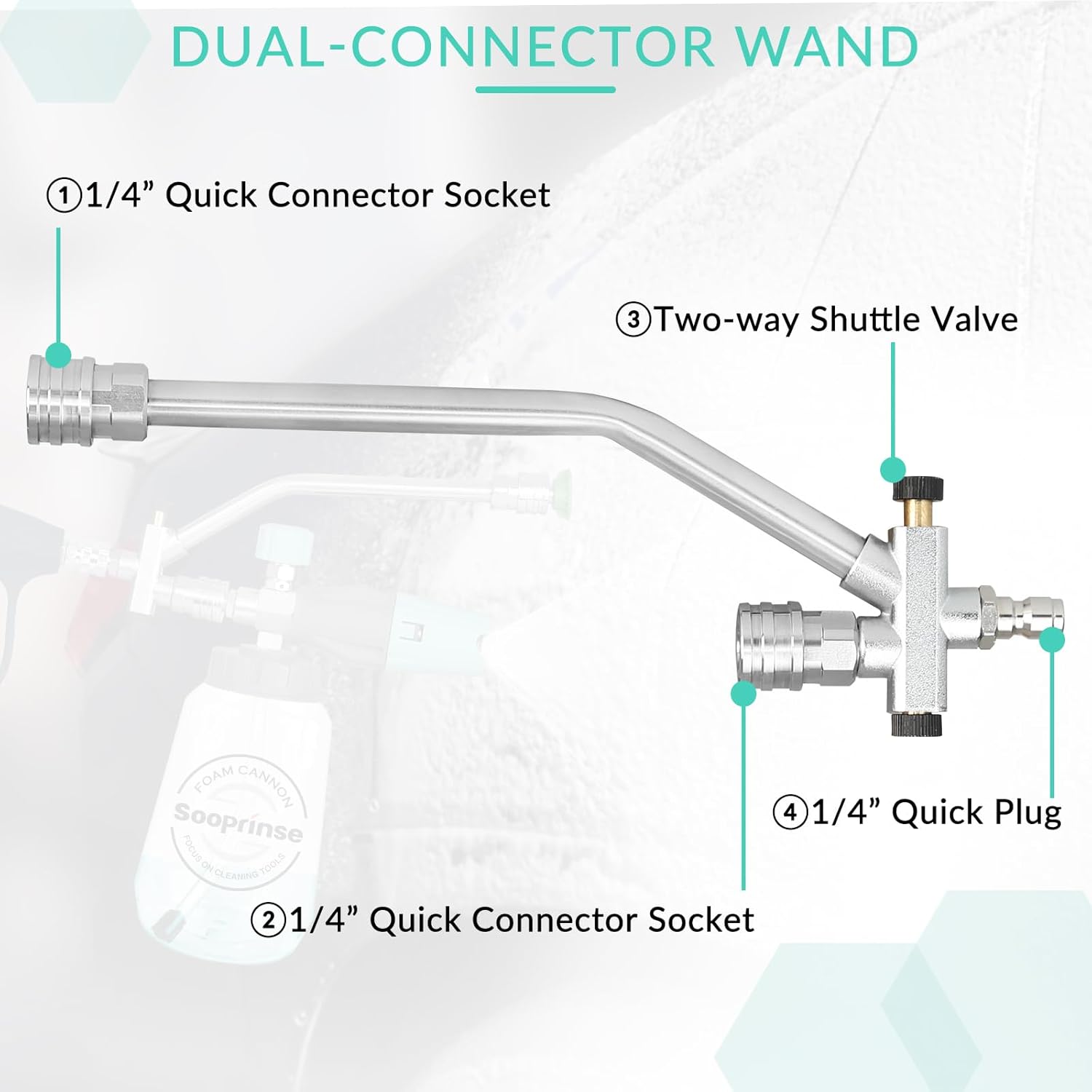 - 【Double-ended Design】 The foam cannon dual connector has a unique double-ended setup. One end is longer for the pressure washer nozzle, and the shorter end is for the foam cannon. This design ensures smooth water flow when using the nozzle, even with the foam dispenser attached.