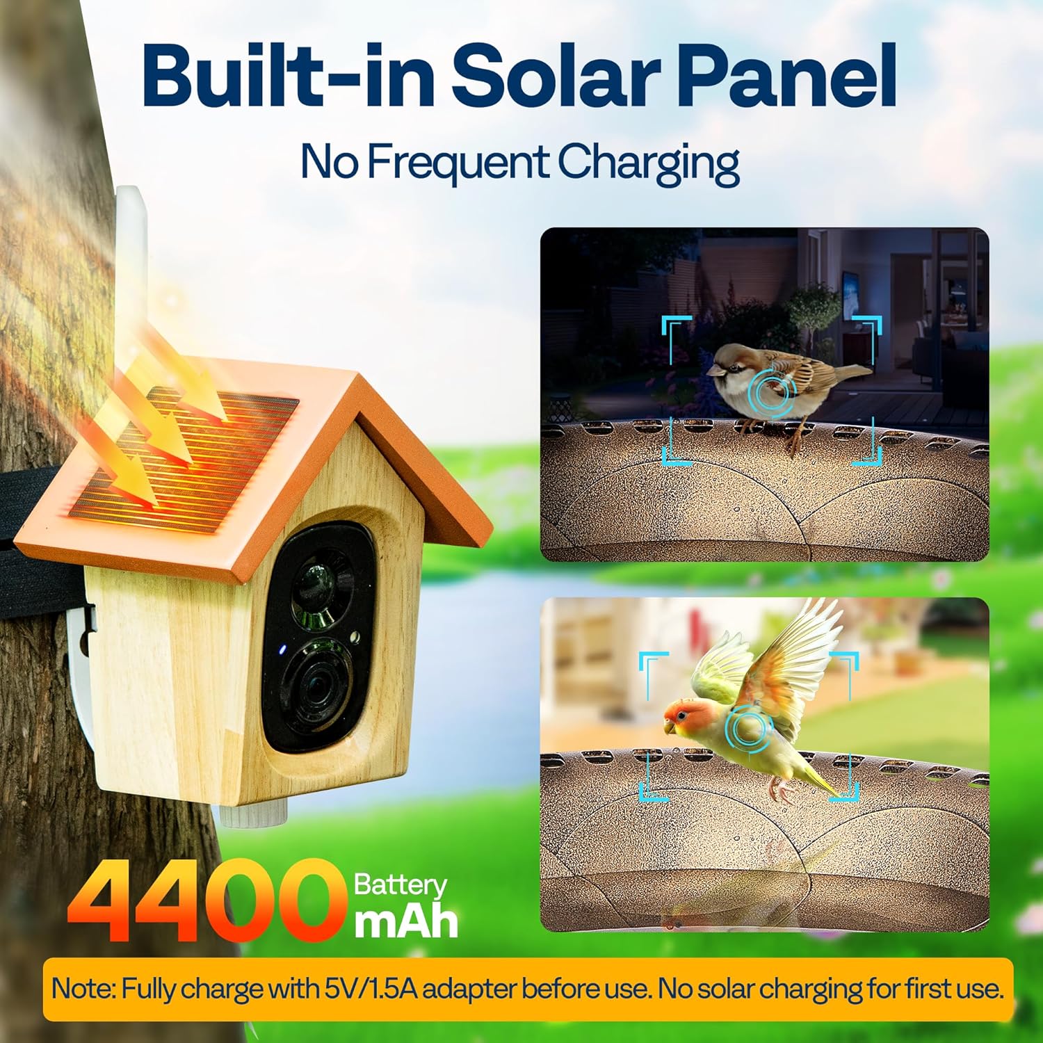 - SOLAR-POWERED & WEATHER-RESISTANT: Built with a 4400mAh lithium battery and a fixed solar panel, the bird bath stays powered without frequent charging and can remain on standby for up to 5 months; The basin is made of high-quality polypropylene with a protective resin coating, which is not easy to fade or age; The wooden housing is crafted from eco-friendly wood and can be DIY-painted; The camera features IP65 waterproofing, ensuring reliable performance in sun, rain, wind, and cold weather