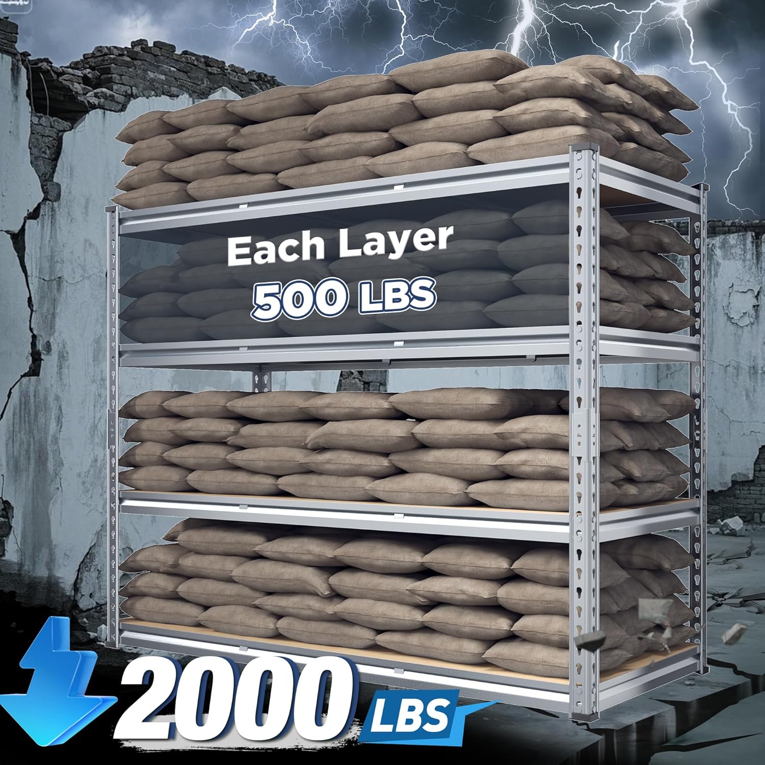 - 【Garage Shelving - 2000LBS Capacity】REIBII garage shelves are built like a tank! Thick steel legs and chunky boards can carry 500lbs on each shelf – that's 2000lbs total! Suit for stacking toolboxes, car parts, or even your camping gear. No wobbling, no bending, just rock-solid storage