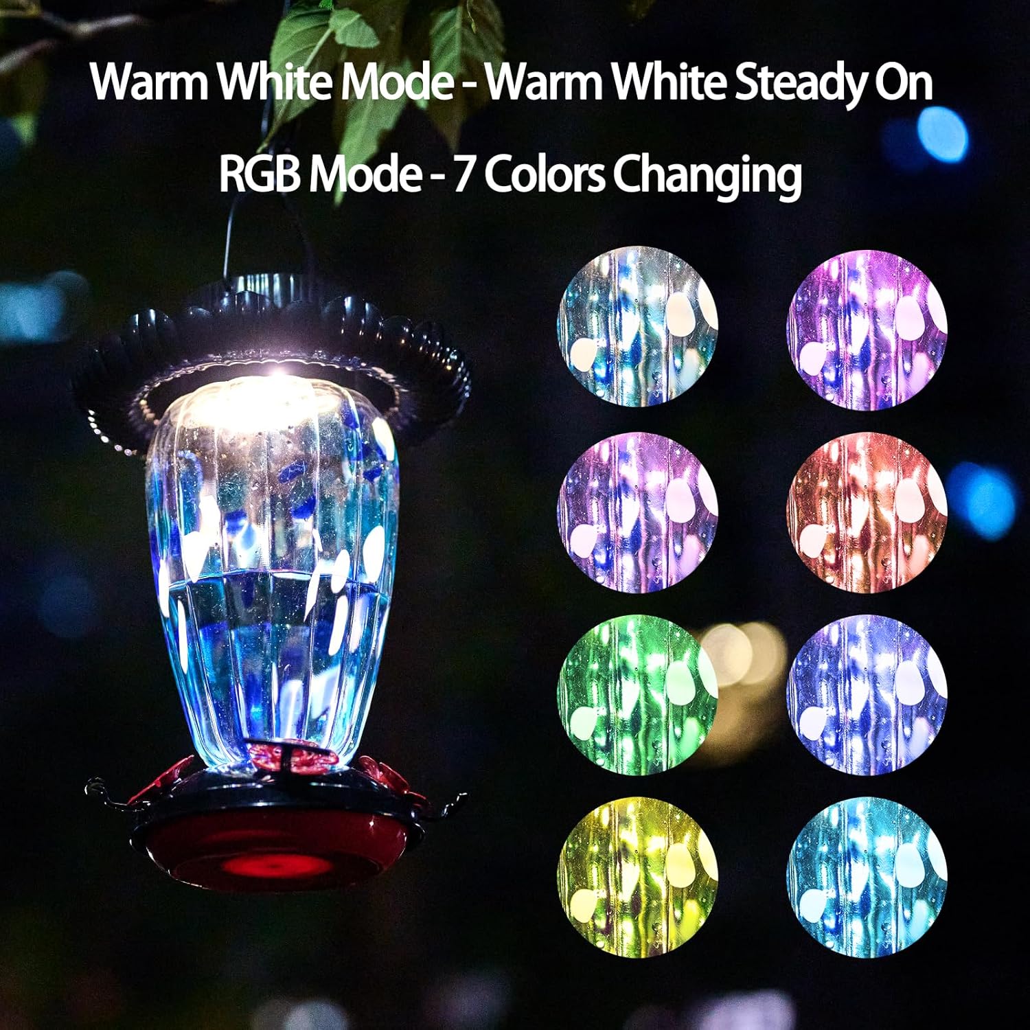 - 【RGB Mode & Warm White Mode】Muse Garden hanging solar lantern's RGB Mode has 7 color changes automatically, our solar powered hanging humming bird feeder can still illuminate the birds feeding while decorating your garden.