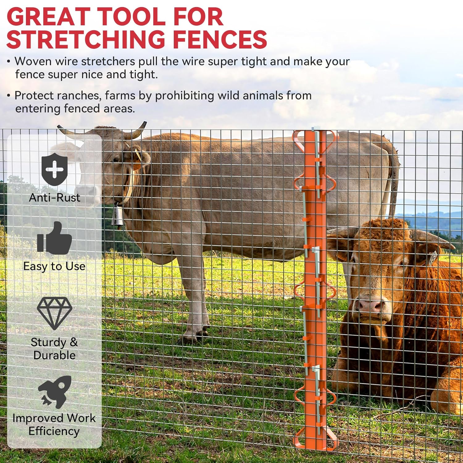 - Staggered Wedge Design: Package includes 4.4ft woven wire fence stretcher bar and 5 sturdy wedges. The wedges are vertically spaced and staggered to provide powerful tension and stability. They securely grip the wire to prevent slippage, helping to quickly straighten the woven net and reduce sagging or deformation during installation.