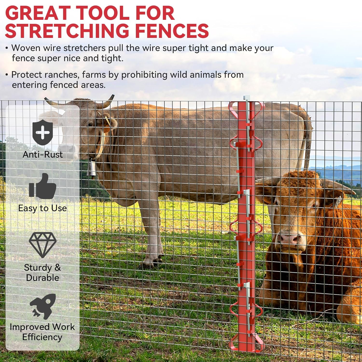 - Staggered Wedge Design: Package includes 4.4ft woven wire fence stretcher bar and 5 sturdy wedges. The wedges are vertically spaced and staggered to provide powerful tension and stability. They securely grip the wire to prevent slippage, helping to quickly straighten the woven net and reduce sagging or deformation during installation.