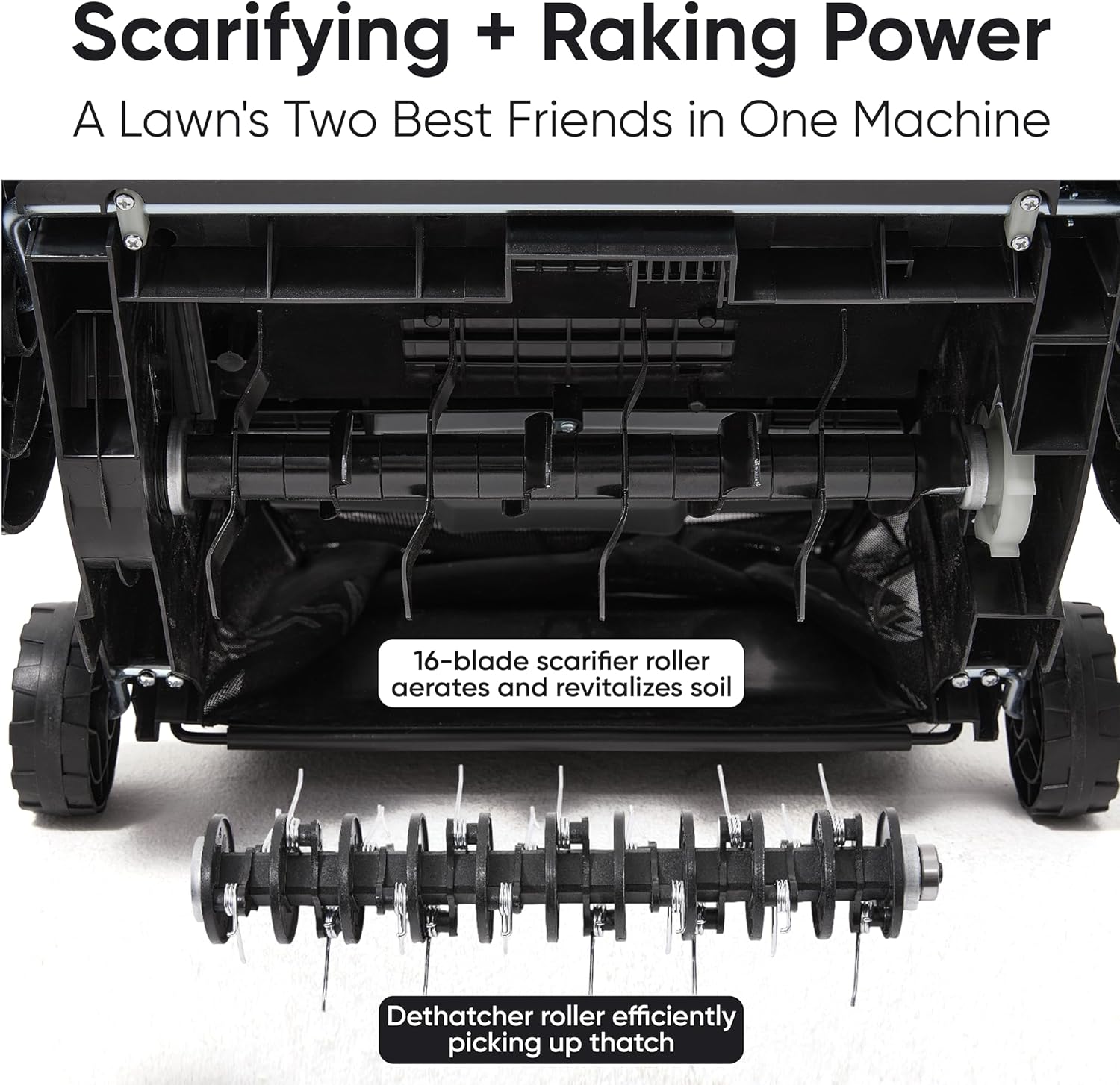 - Heavy-Duty Blade System – 16 Precision Blades + 20 Spring Steel Tines Equipped with 16 hardened steel scarifier blades and 20 spring-loaded tines for deep lawn penetration. Perfect for lifting thick thatch, breaking up compacted soil, and promoting healthier lawn growth.