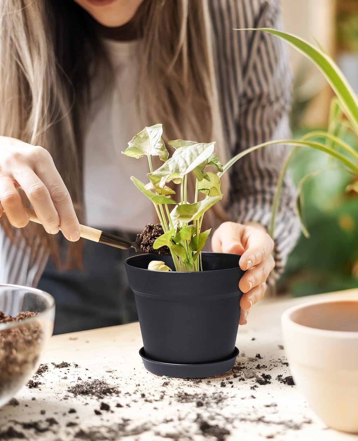 - 【Excellent Drainage System and Matching Tray】The porous drainage design of this plastic plant pots solves the drainage problem,and the small holes of arranged at the bottom can ensure that the drainage system will not be blocked and it also will not cause soil leakage.And pots for plants are provided a removable tray to collect excess water without worrying about leaks and damage to the floor,perfect for indoor use.
