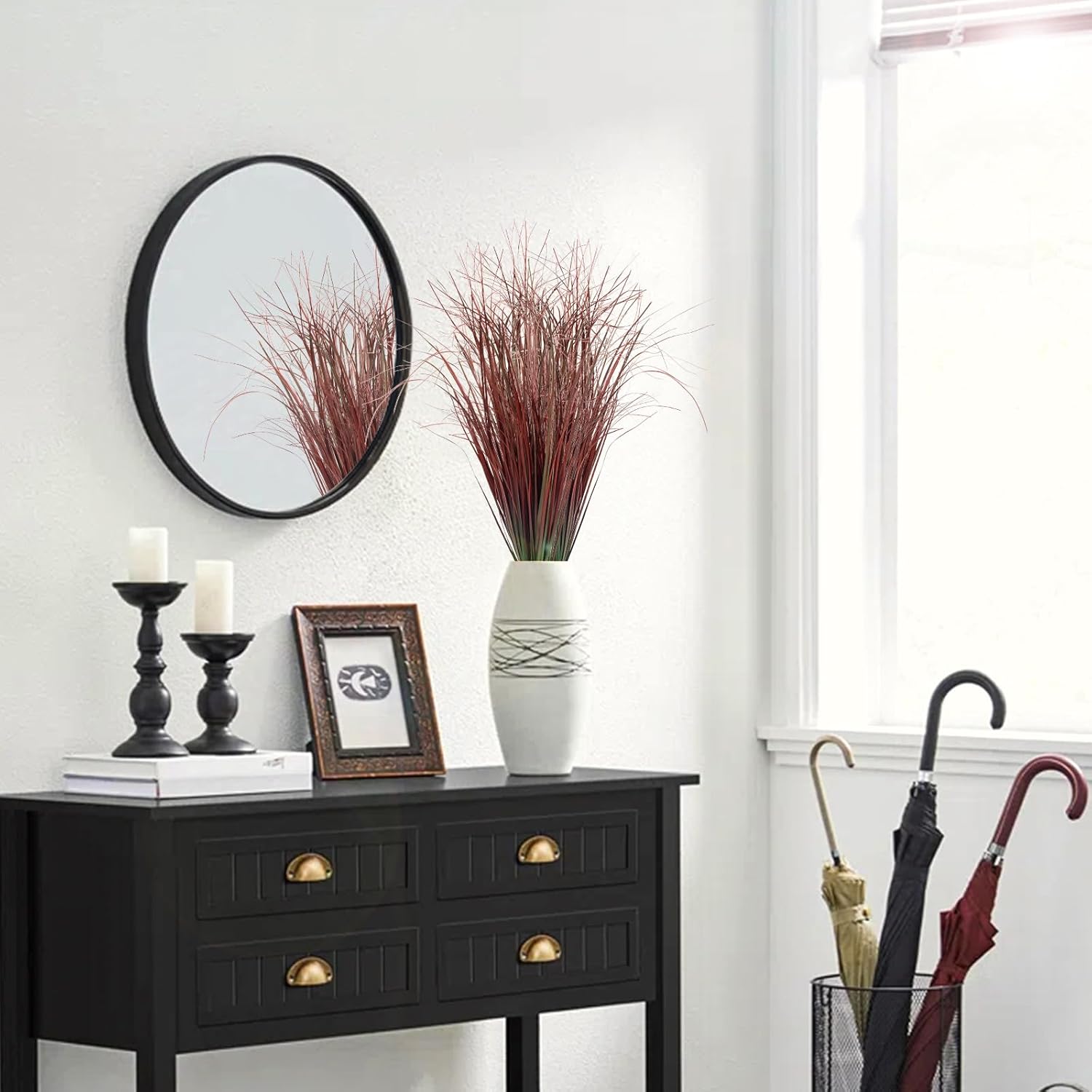 - 【VIVID FAKE GRASS STEMS】 Faux wheat grass is an ideal companion for indoor plants or rustic greenery. You don’t have to worry about mosquitoes brought by real grass. It resists UV rays and remains a vibrant green all year round and will keep a fresh look for years to come.