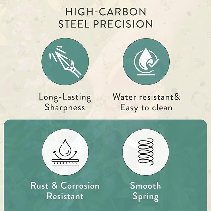 - Premium High-Carbon Steel Blades:Crafted from high-carbon steel with a rust-resistant, chrome-plated finish, these blades deliver sharp, clean cuts that minimize damage & promote fast healing for your plants; The durable garden shears for gardening feature fine, needle-nose blades perfect for precise herb and flower snipping, while the bypass plant pruners handle thicker branches and tougher stems without crushing