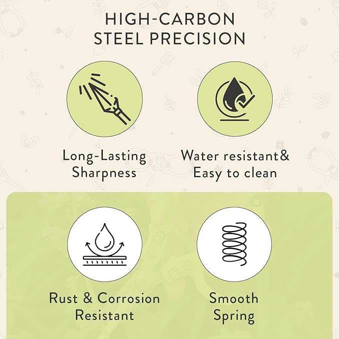 - Premium High-Carbon Steel Blades:Crafted from high-carbon steel with a rust-resistant, chrome-plated finish, these blades deliver sharp, clean cuts that minimize damage & promote fast healing for your plants; The durable garden shears for gardening feature fine, needle-nose blades perfect for precise herb and flower snipping, while the bypass plant pruners handle thicker branches and tougher stems without crushing