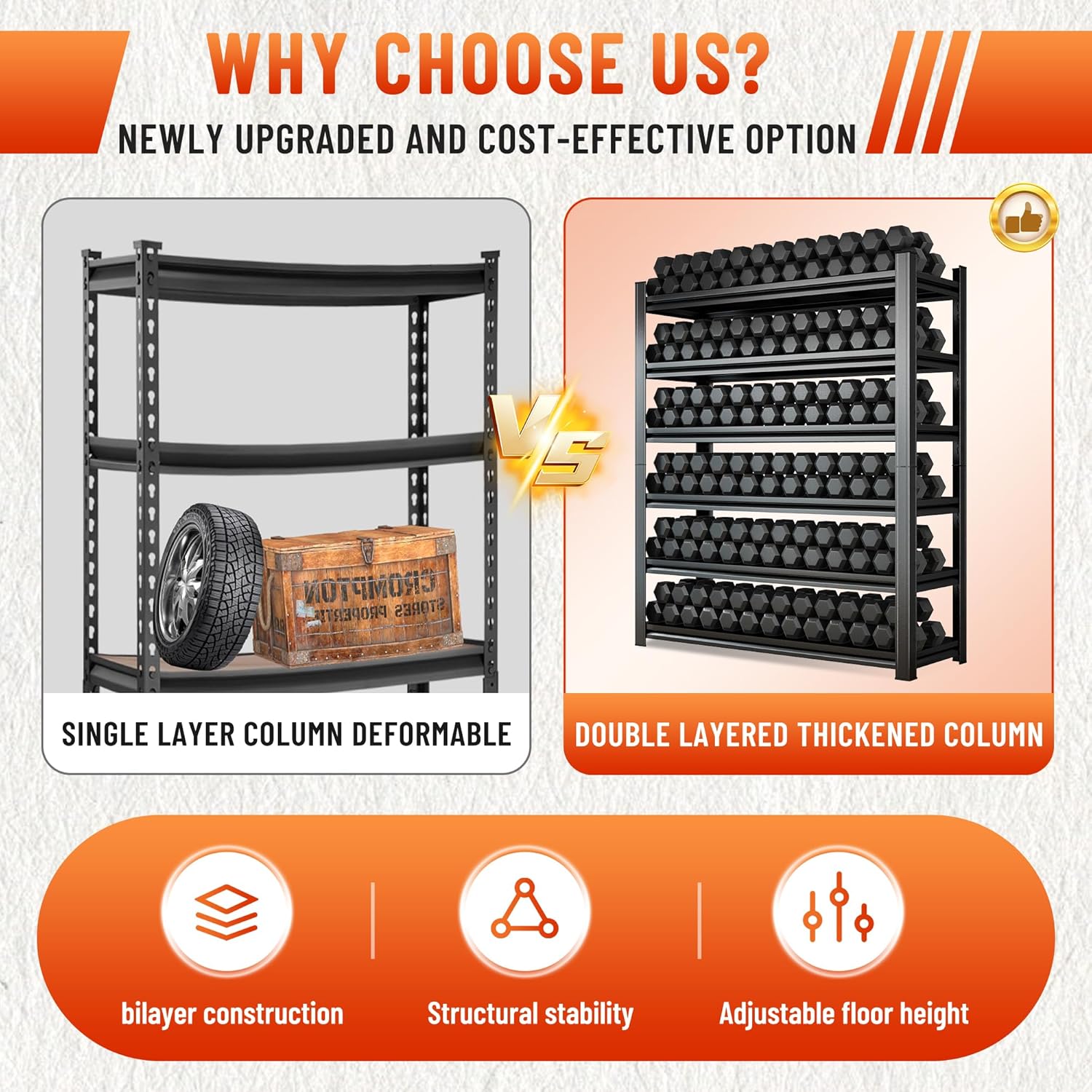 - 【The double-layer column is more stable and reliable】Our garage shelves adopt double-layer columns, which are more stable and reliable than single-layer columns on the market. In the process of long-term use, there will be no bending and warping. The double-layer column greatly improves the weighing capacity of the partition, and even if a heavy object like an engine is placed on it, it will not shake.