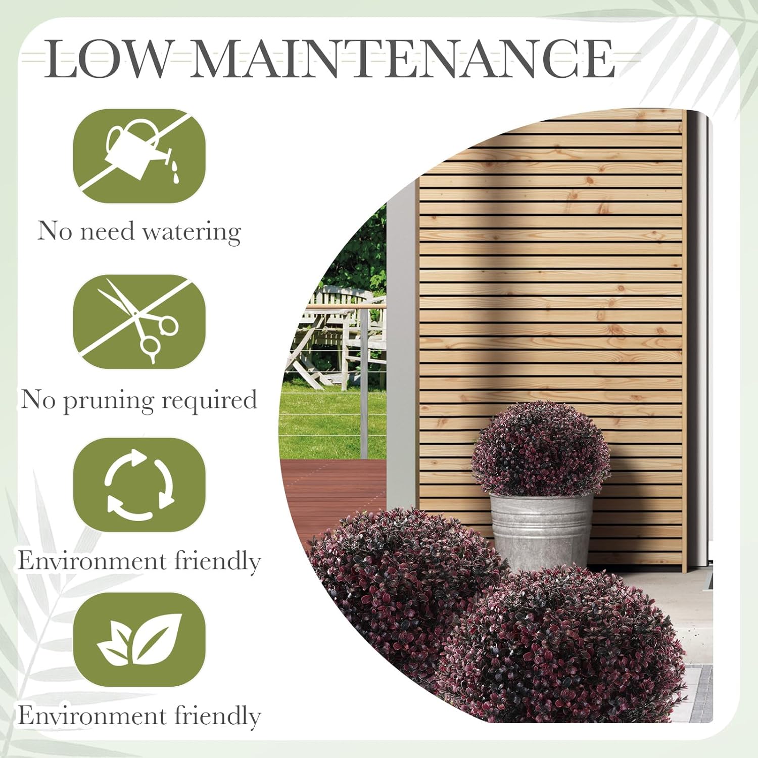 - Low Maintenance: our outdoor artificial shrubs do not need watering or pruning; No matter how the seasons change, they remain green and full of vitality all year round; Just put them anywhere you want to add a sense of decoration, and keep them beautiful green all year round