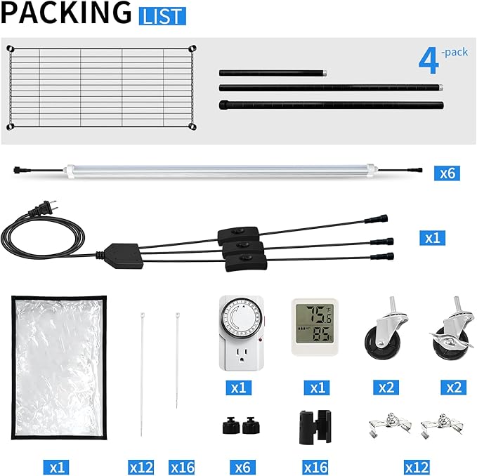 - 【Packaging List】- Metal Plant Stand Kit x1, T8 LED Grow Lights x6, Tiered Control Power Cord x1, Greenhouse Tent x1, Long Installation Zip Ties x12, Short Installation Zip Ties x16, Mechanical Timer x1, Thermo-Hygrometer x1, User Manual x1.