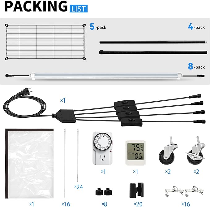 - 【Packaging List】- Metal Plant Stand Kit x1, T8 LED Grow Lights x8, Tiered Control Power Cord x1, Greenhouse Tent x1, Long Installation Zip Ties x12, Short Installation Zip Ties x24, Mechanical Timer x1, Thermo-Hygrometer x1, User Manual x1.