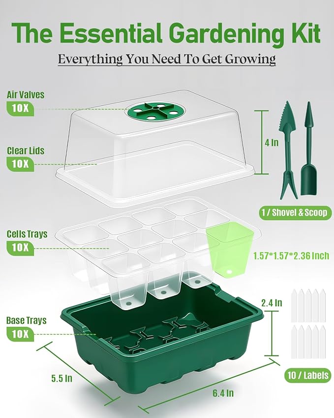 - Complete Seed Starting Kit: The set includes 10 twelve-cell seed starter trays, 10 humidity domes, 10 base trays, 1 shovel and scoop tool set, 10 plant labels, and a user manual - providing a complete solution for your seedling cultivation needs