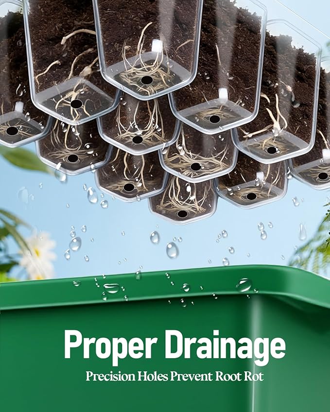 - Effective Drainage: Our seedling tray features strategically designed bottom drainage holes that efficiently remove excess water to prevent root rot; The innovative hole design ensures even water flow and consistent moisture for healthy seedling development