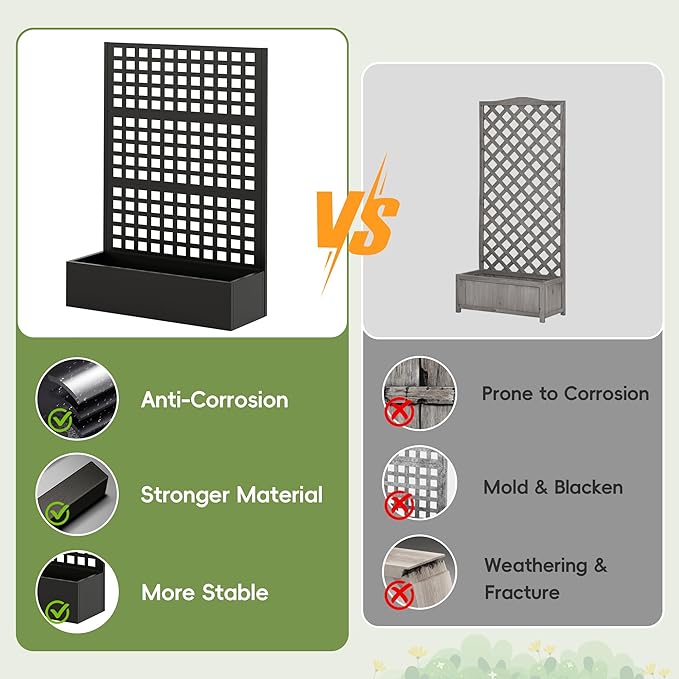 - STURDY MATERIAL - Our planter boxes are made of thick galvanized steel, which is thick and rust-proof, can be reused for many years without any deformation or discoloration. The trellis is welded from steel bars, providing strong load-bearing capacity and allowing for the hanging of decorative flower pots.
