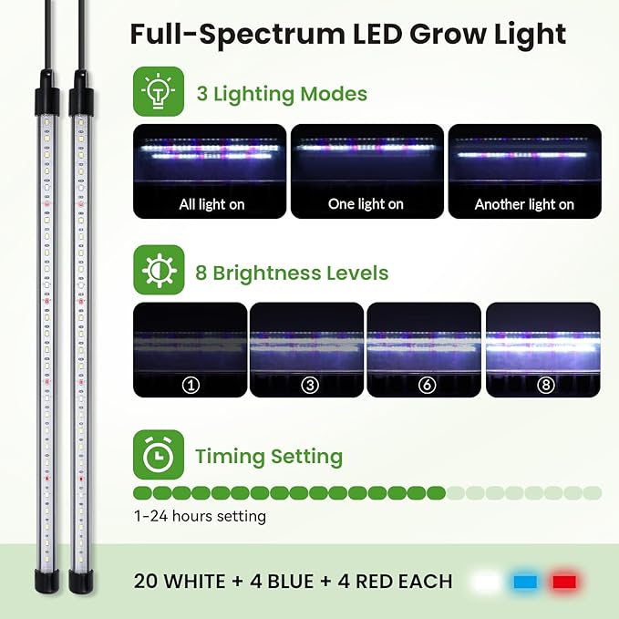 - Advanced LED Grow Light System - Each light strip features 56 high-efficiency LEDs that simulate natural sunlight for optimal seedling development. With adjustable brightness and 24/7 timer functionality, it accommodates all growth stages to accelerate healthy growth of herbs, flowers, and other plants.