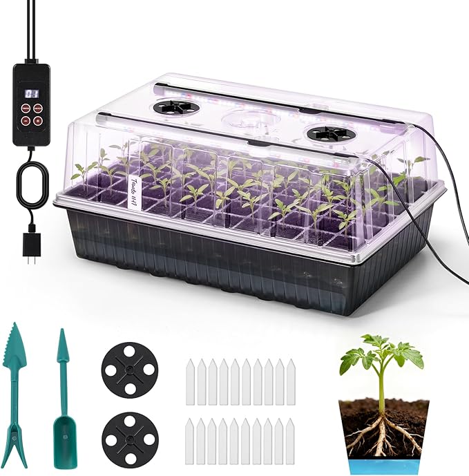 - Complete Gardening Starter Kit - Includes: 1× humidity dome, 2× vent covers, 1× 60-cell tray, 1× base tray, 1× capillary mat, 1× plant stand, 1× grow light system (2 LED strips, 1 controller, 1 detachable adapter), 20× plant labels, and 2× gardening tools. Perfect for beginners and an ideal gift.